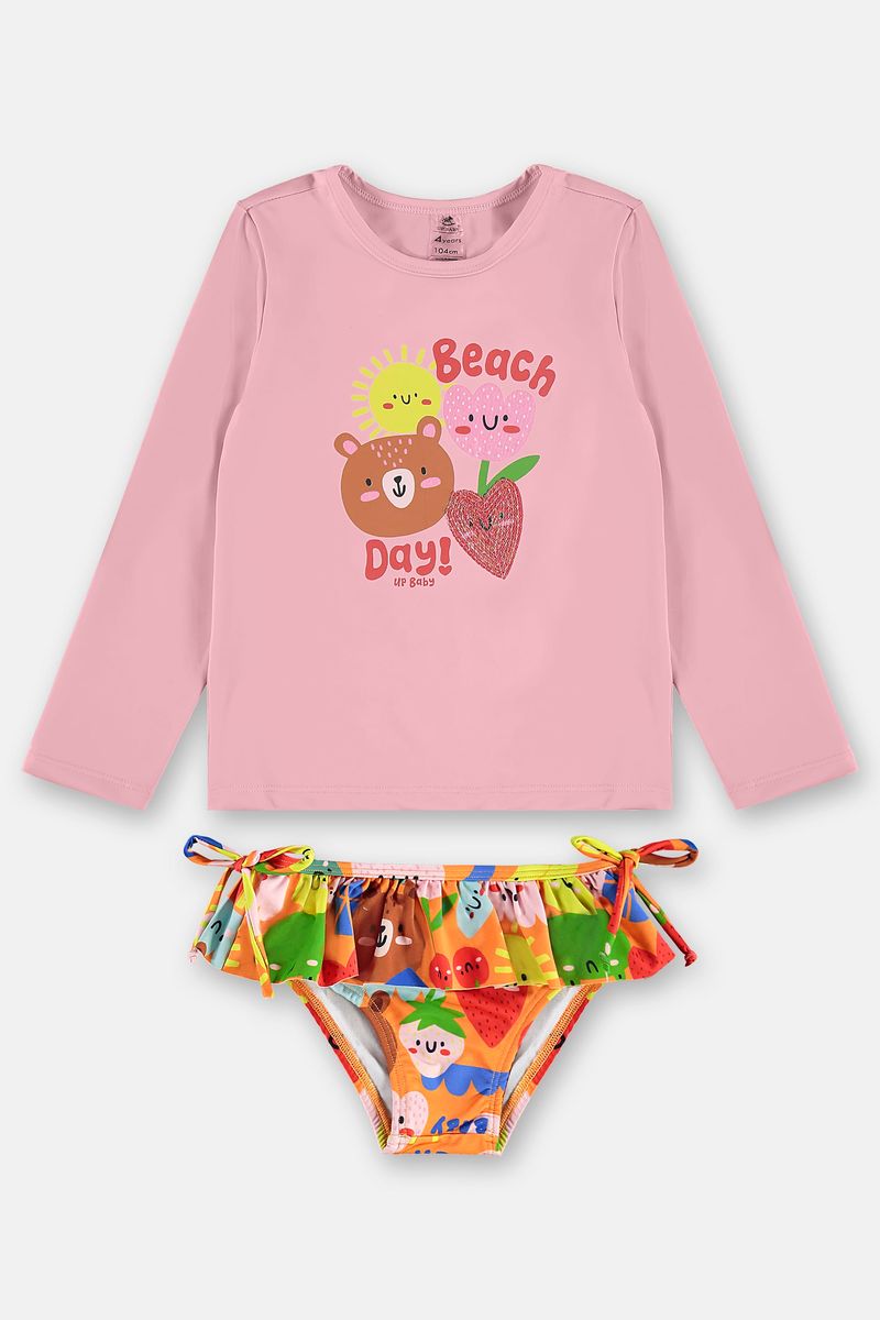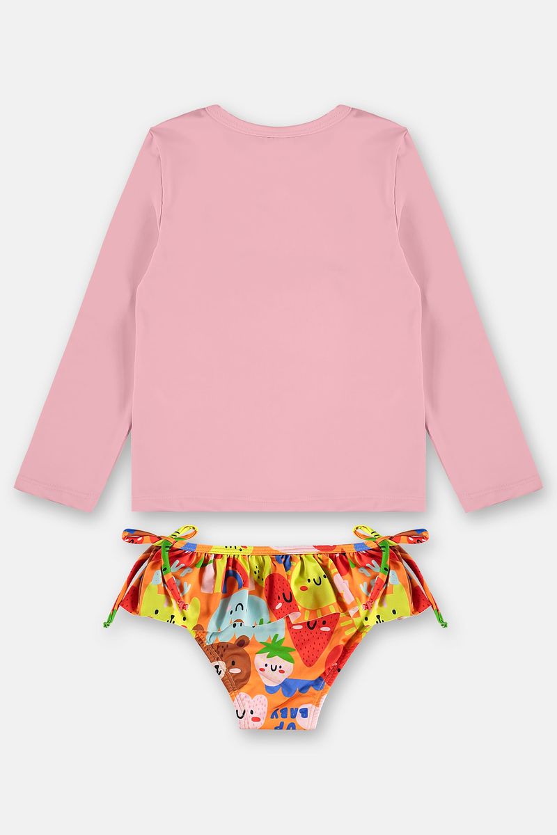 Biquíni infantil, ideal para proporcionar proteção e estilo para sua pequena. Ambas as peças são feitas em malha de poliéster e elastano, contam também com forro em poliamida e proteção FPS+50. A blusa manga longa conta com estampa frontal criativa e divertida com bordado aplicado, garantindo um visual alegre. A calcinha conta com elástico embutido, babado franzido e detalhe de laços nas laterais, oferecendo um ajuste prático. Perfeito para aproveitar os dias de praia e piscina, mantendo o conforto.