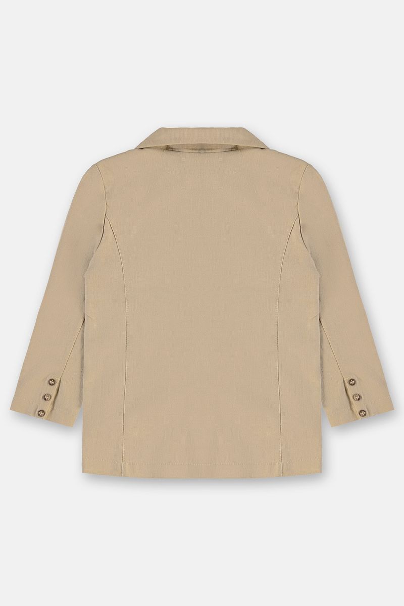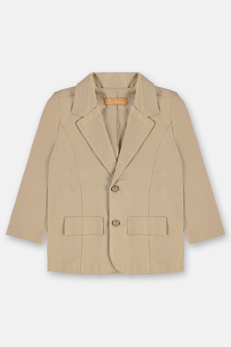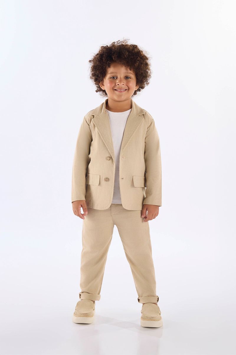Blazer infantil para menino, une estilo refinado e conforto. Confeccionado em tecido de linho com elastano oferece caimento impecável e toque confortável. O modelo conta com gola clássica, lapela estruturada, abertura frontal com botões de madeira e bolsos funcionais que completam o visual. Uma opção versátil podendo ser usada em sobreposição com camisas ou camisetas, criando composições tanto formais quanto modernas.