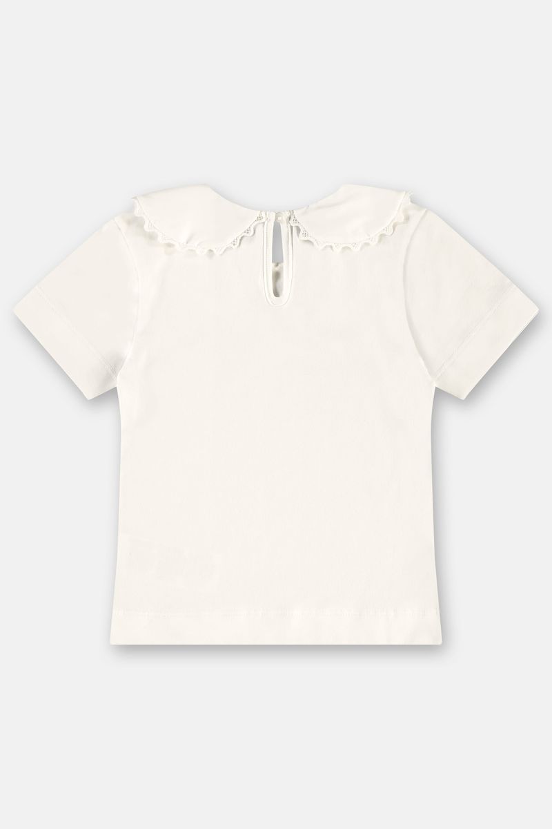 Blusa para menina confeccionada em cotton, tecido composto por algodão e elastano que garante toque macio e confortável durante o uso. O charme está na gola boneca em algodão com detalhe delicado de renda embutida, que acrescenta um toque especial à peça. Possui plaquinha personalizada no peito, costuras reforçadas e abertura em formato de gota nas costas com botão e elástico, que facilita a troca. Uma opção versátil para combinar com saias, calças ou shorts.
