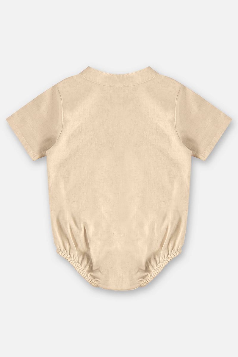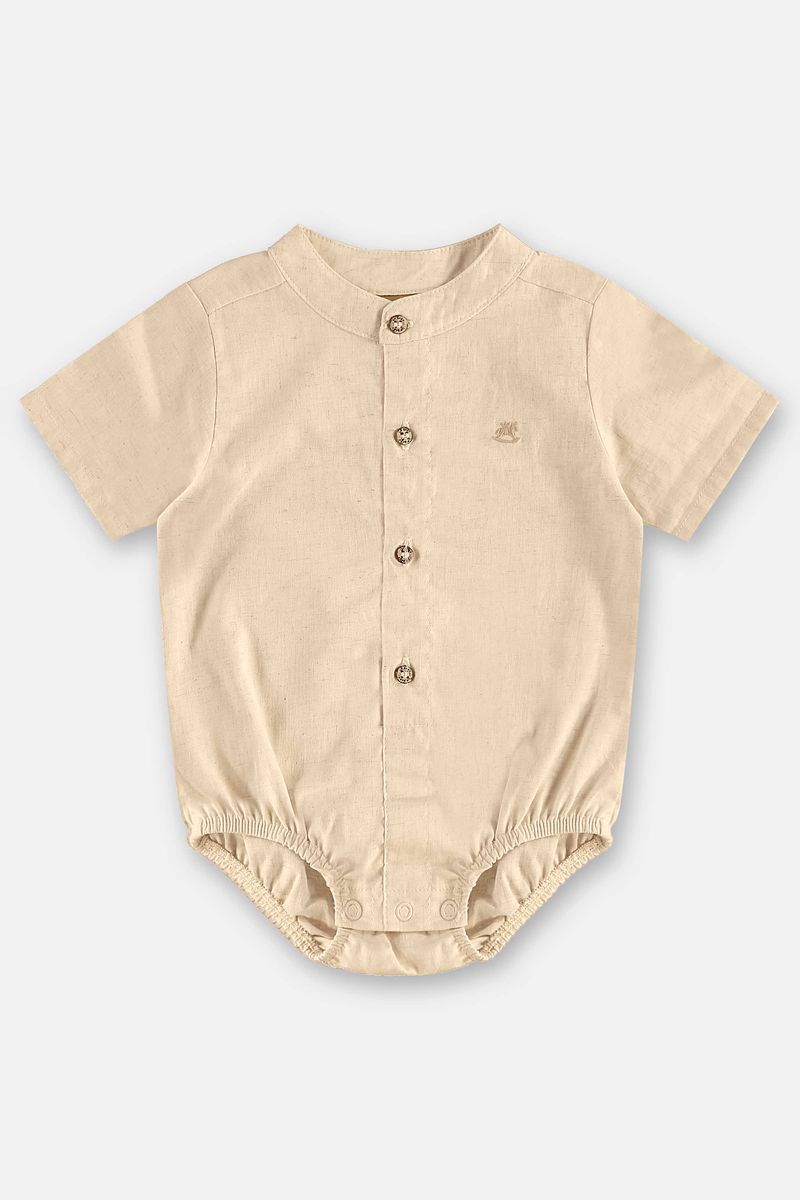 Body camisa para bebê menino confeccionado em tecido de algodão com linho, que oferece leveza, frescor e elegância. Possui gola arredondada, fechamento frontal com botões e detalhe de bordado delicado no peito. Conta ainda com abertura entrepernas com botões de pressão, tornando a peça prática na hora de trocar o bebê. Ideal para ocasiões especiais, une conforto e um visual arrumadinho.