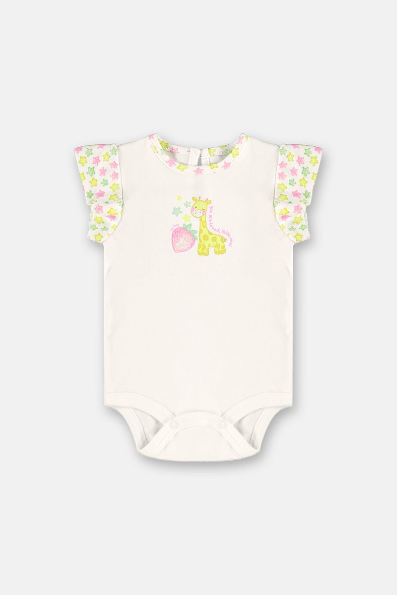 Deixe sua bebê ainda mais encantadora com este conjunto composto por body e calça. O body tem manga curta franzida com detalhe delicado, estampa divertida de girafa e aplicação de strass que acrescenta um toque especial. Produzido em tecido macio de algodão, possui abertura inferior com botões de pressão que facilitam a troca. A calça clochard completa o visual com cintura de elástico confortável, cadarço decorativo e punhos ajustados para melhor caimento. Perfeito para o dia a dia, une conforto e estilo. Uma escolha ideal para vestir sua pequena em qualquer ocasião.