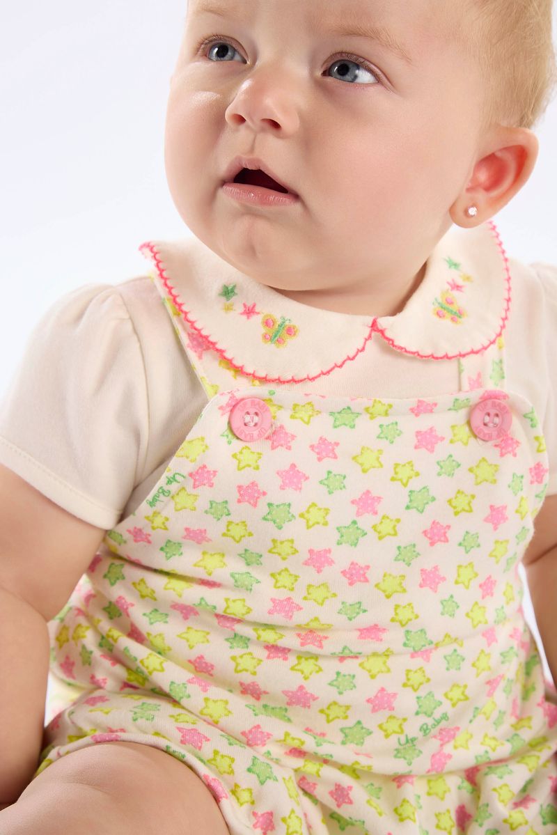 Conforto e charme definem este conjunto para bebê menina, formado por body com gola dupla bordada e jardineira floral com alças reguláveis. O body é confeccionado em algodão macio, com abertura em botões de pressão que facilitam a troca. A gola com acabamento em picueta e bordado delicado adiciona um toque especial ao visual. A jardineira estampada possui elástico nas costas e no entrepernas, garantindo melhor ajuste e liberdade de movimento. Perfeito para passeios ou ocasiões especiais, é uma opção prática e encantadora para o dia a dia da sua pequena.