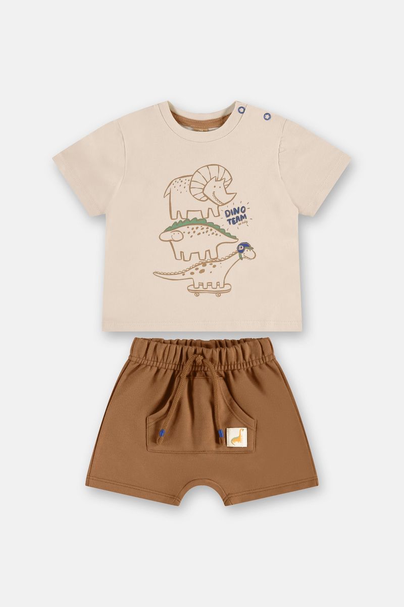 Conjunto para bebê menino, uma opção versátil que une conforto e estilo para o dia a dia. A camiseta possui uma divertida estampa de dinossauros e, para facilitar o vestir nos menores (tamanhos P a G), conta com uma prática abertura no ombro com botões de pressão. O short complementa o look com cós elástico, cadarço decorativo e um bolso funcional na frente, perfeito para as brincadeiras do seu pequeno.