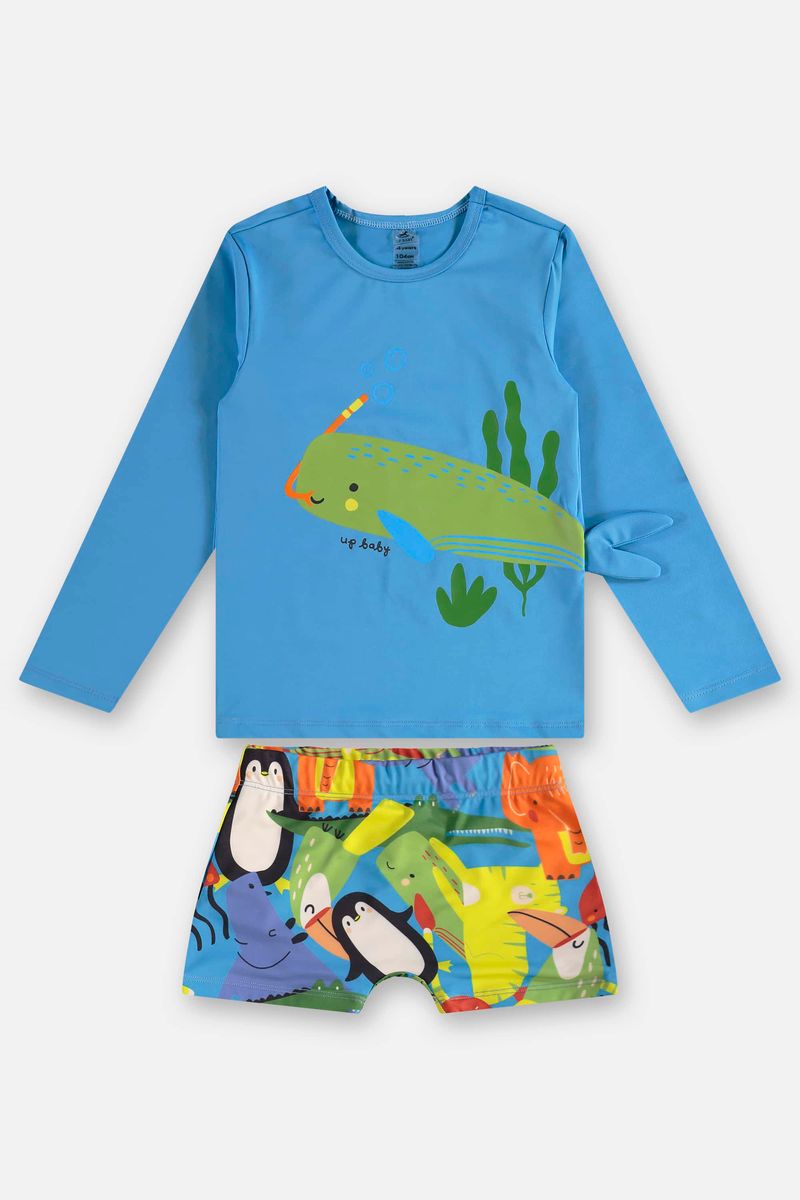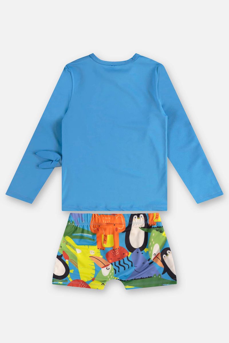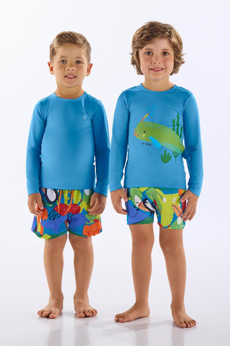 Conjunto infantil para menino, composto por camiseta manga longa em malha com proteção solar FPS +50 e sunga boxer em microfibra sublimada com forro. A camiseta possui estampa frontal e aplique decorativo. A sunga tem elástico no cós e acabamento com forro interno em poliamida.