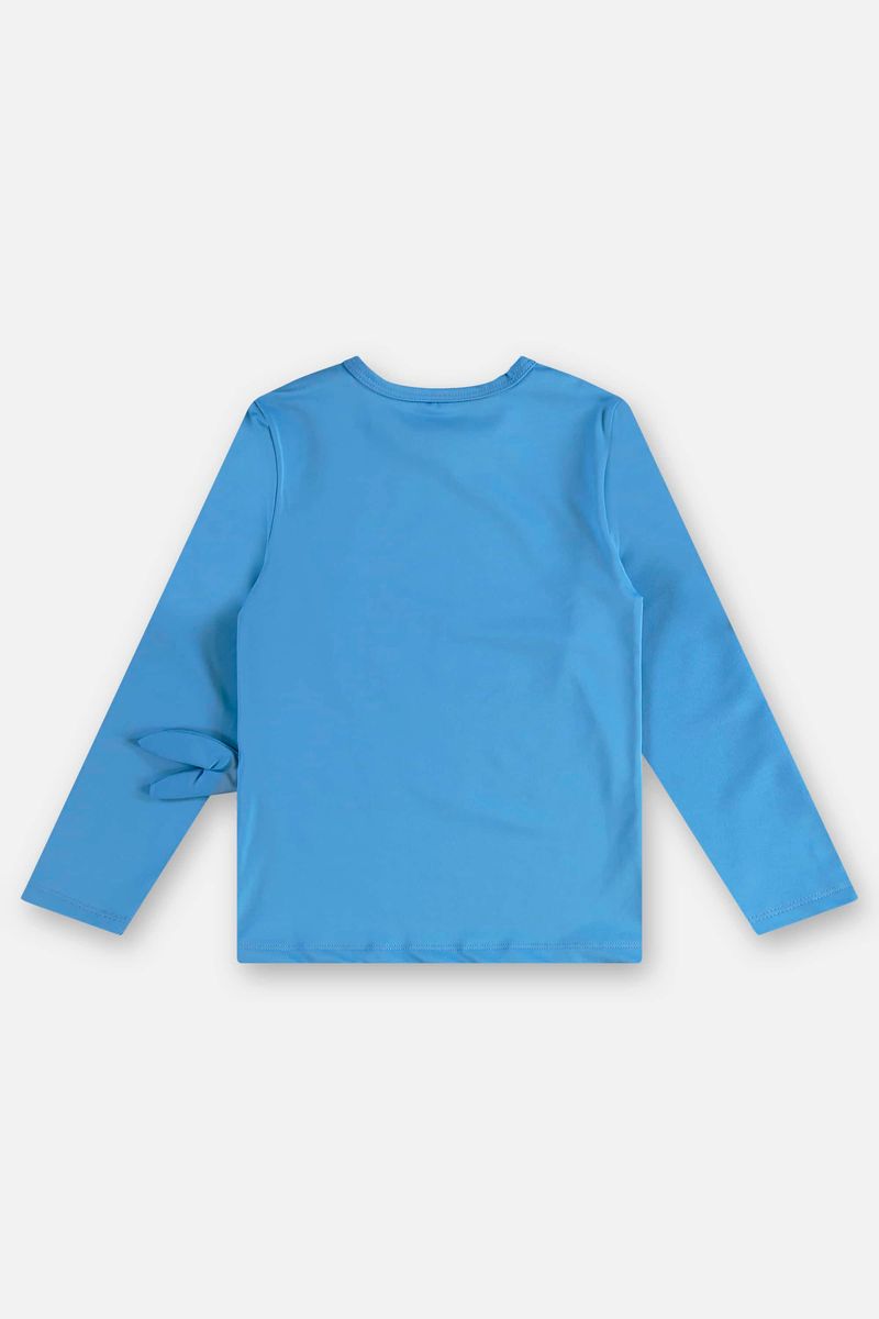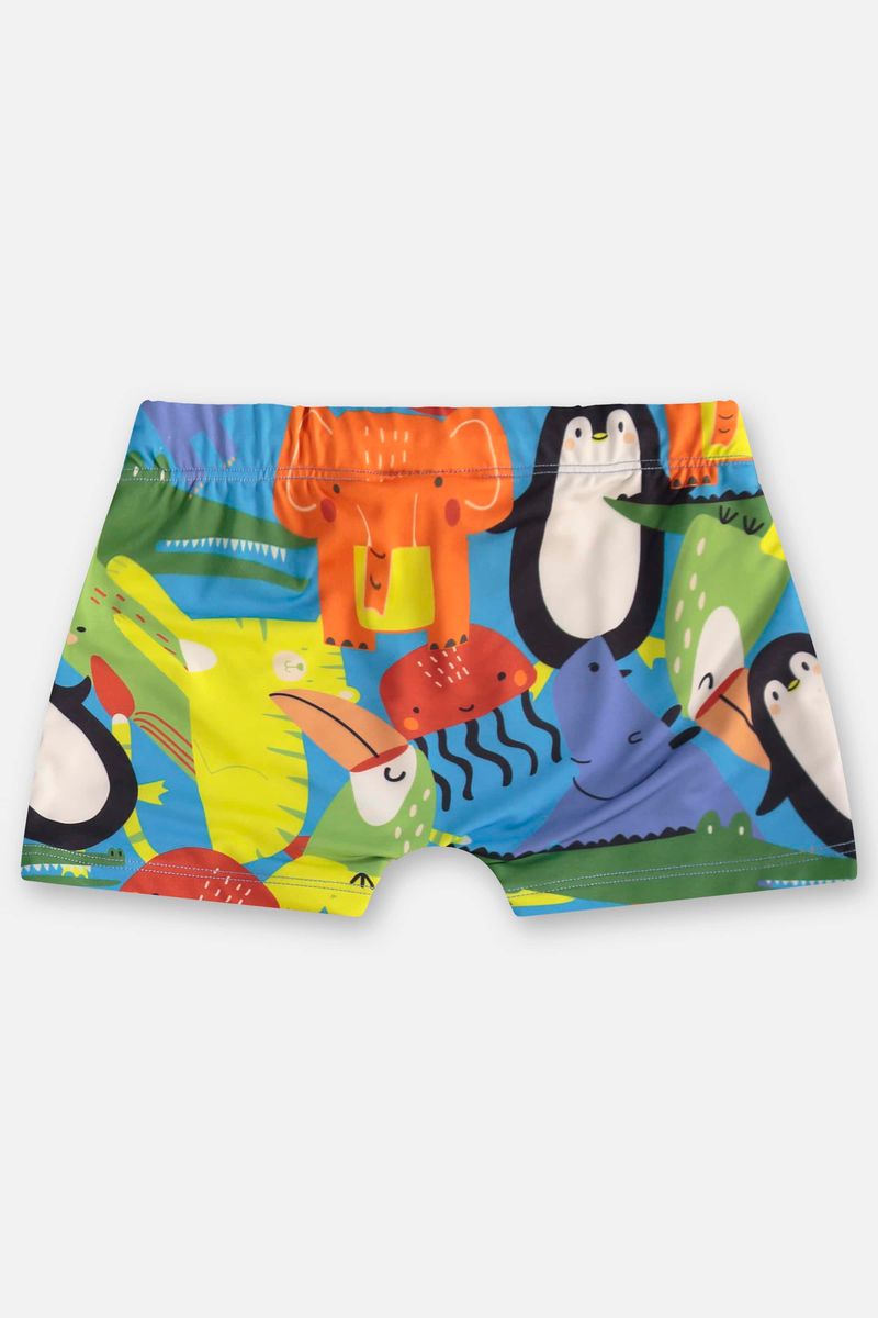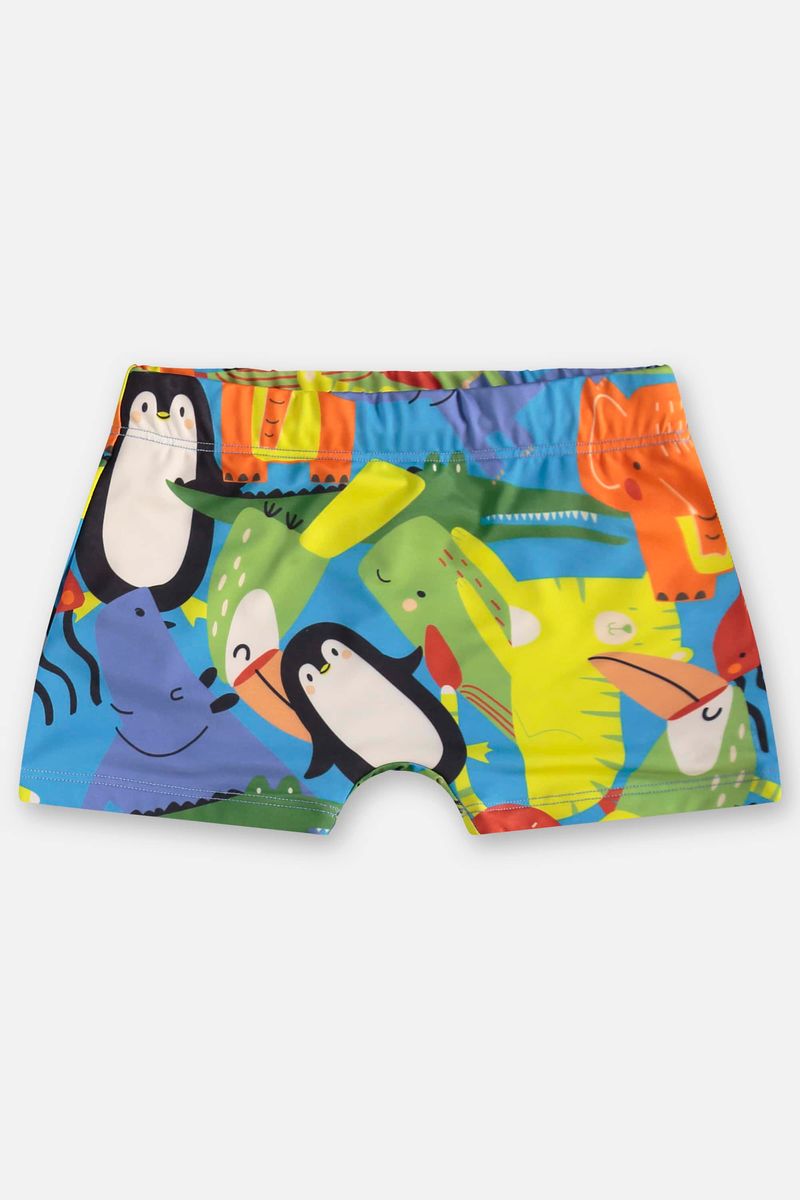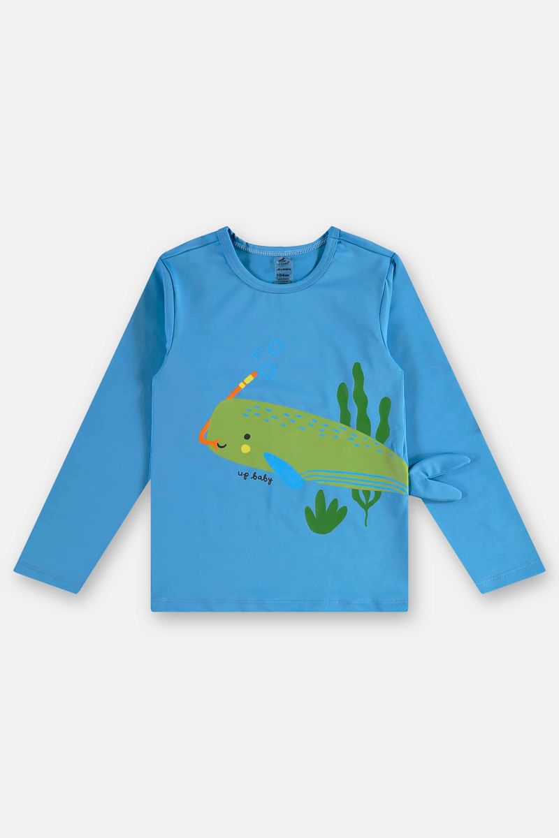 Conjunto infantil para menino, composto por camiseta manga longa em malha com proteção solar FPS +50 e sunga boxer em microfibra sublimada com forro. A camiseta possui estampa frontal e aplique decorativo. A sunga tem elástico no cós e acabamento com forro interno em poliamida.