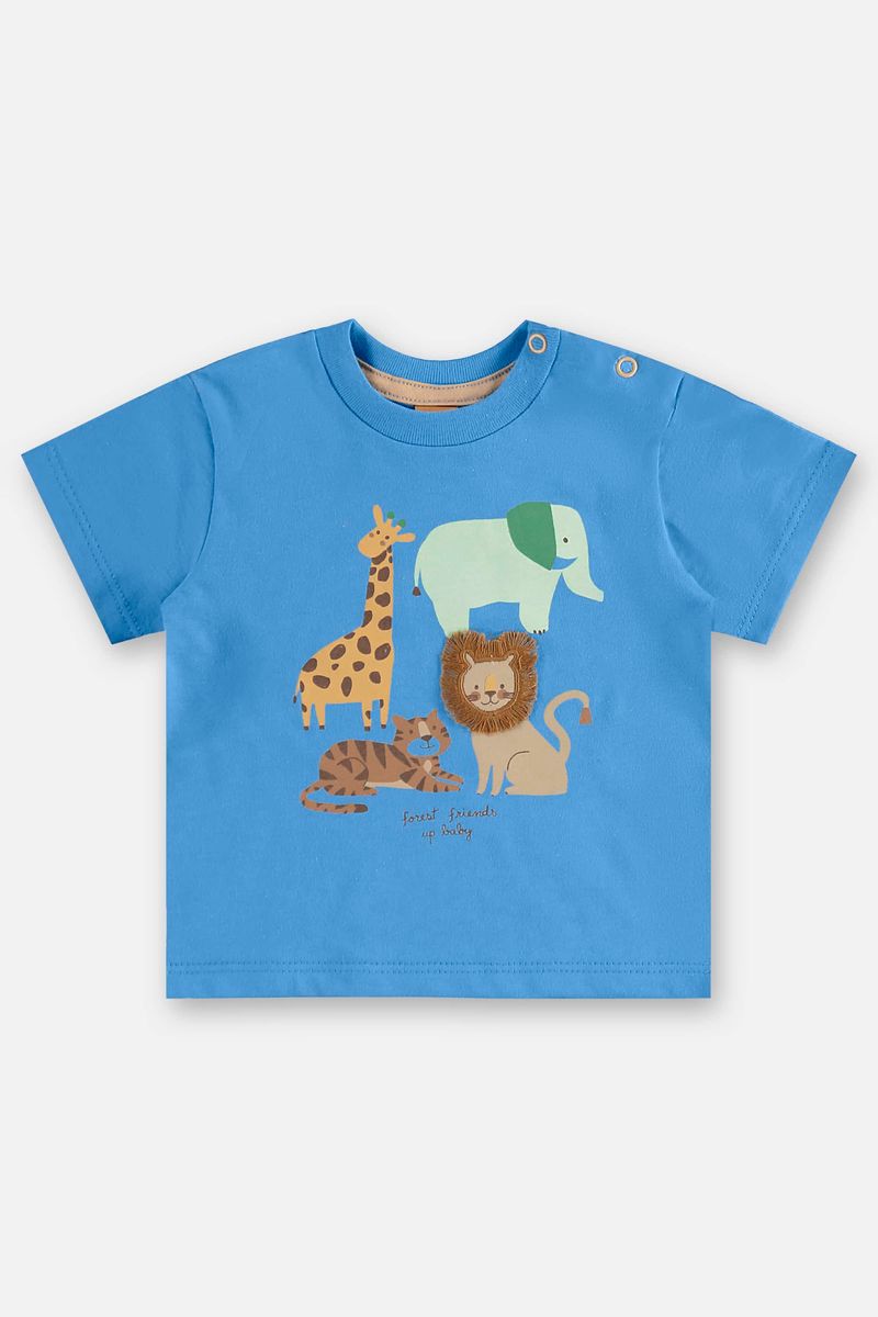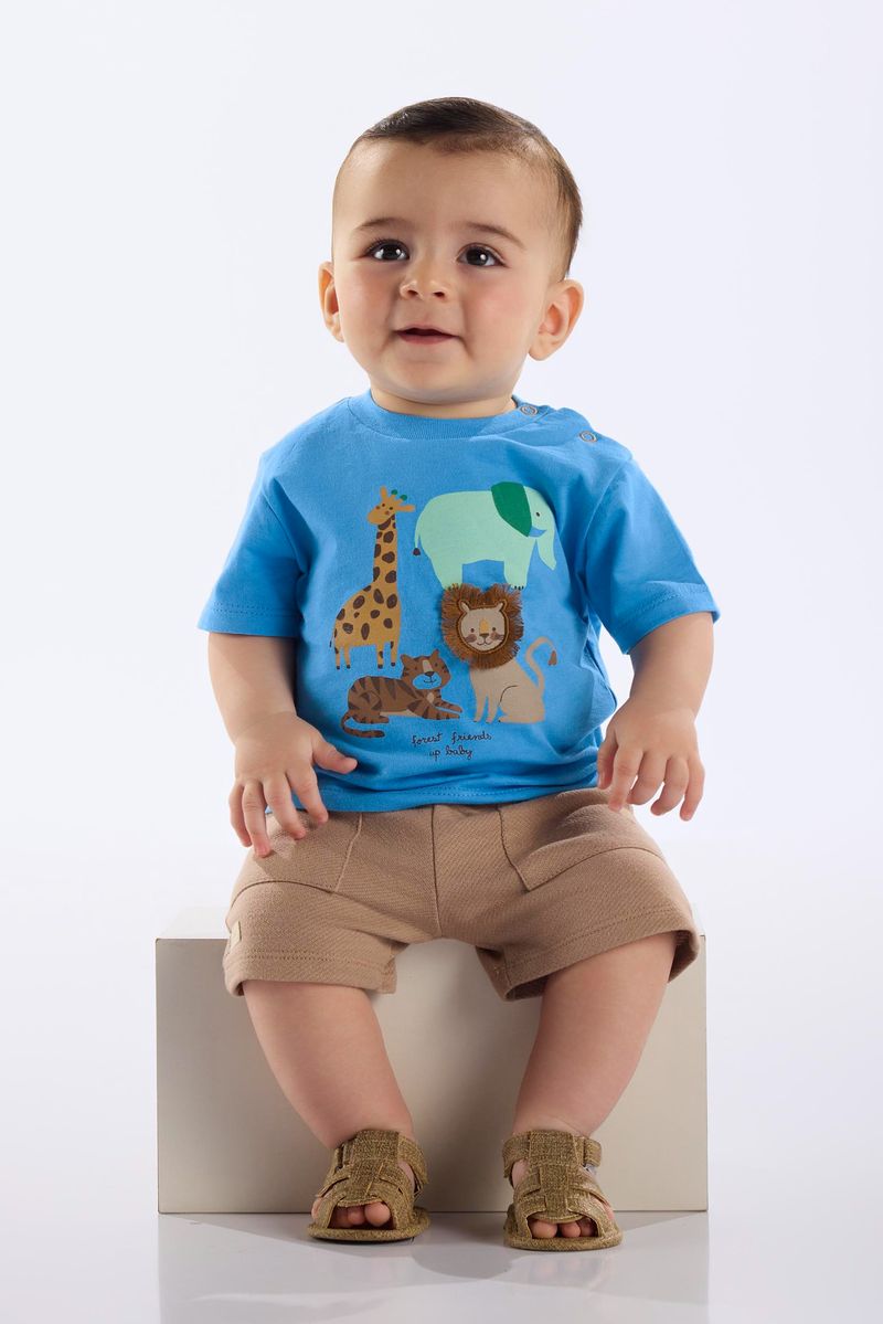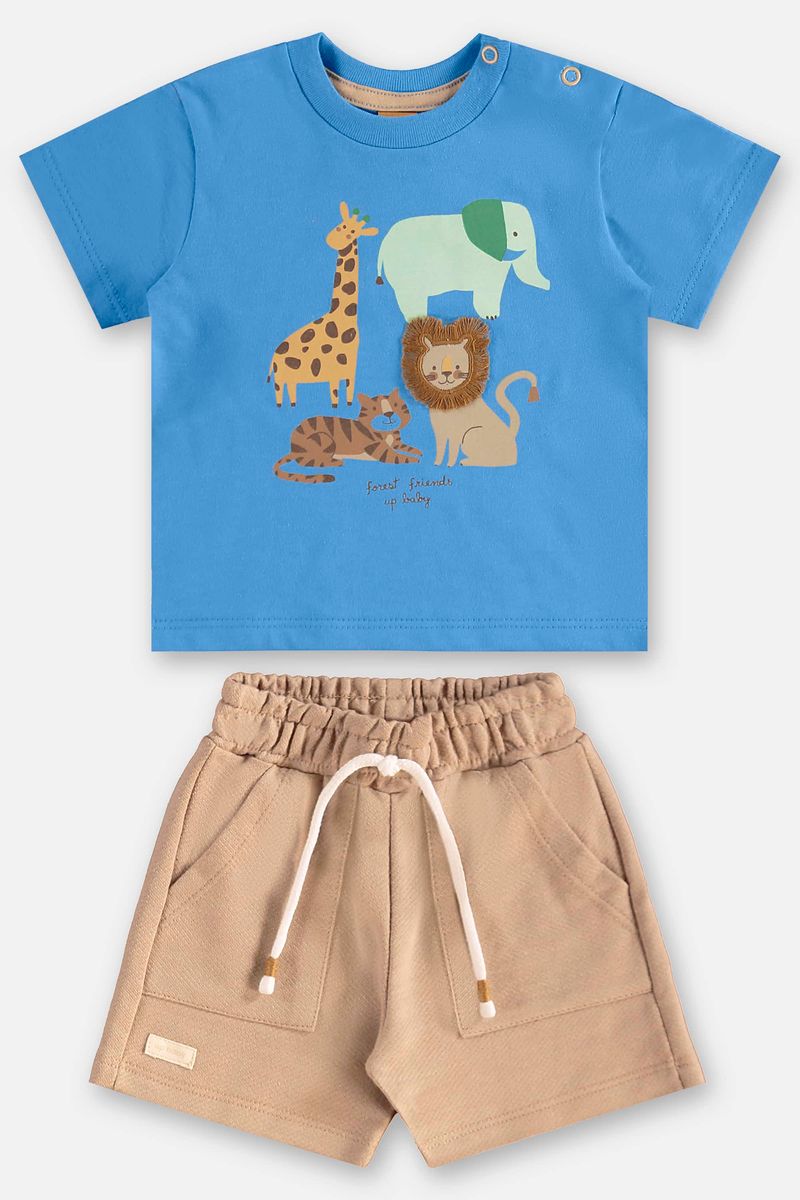 Conjunto para bebê menino composto por camiseta em meia malha de algodão e bermuda em moletom de algodão sem felpa. A camiseta possui gola arredondada em ribana, abertura no ombro com botões de pressão que facilitam na hora de vestir e estampa safari fofa com bordado. A bermuda conta com cós elástico, cadarço decorativo e bolsos laterais funcionais. É uma opção prática, leve e fresquinha para passeios e brincadeiras.