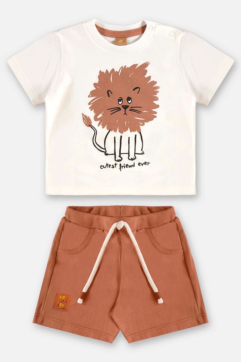 Conjunto para bebê menino com camiseta em meia malha de algodão e bermuda em moletinho rústico de algodão, que oferece toque macio e confortável para o dia a dia. A camiseta tem estampa divertida de leão e abertura no ombro com botões de pressão, facilitando a troca. A bermuda possui cós com elástico para ajuste prático, além de bolso e cadarço decorativos. Ideal para momentos de lazer, passeios ou para brincar com estilo.