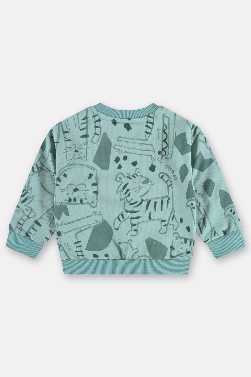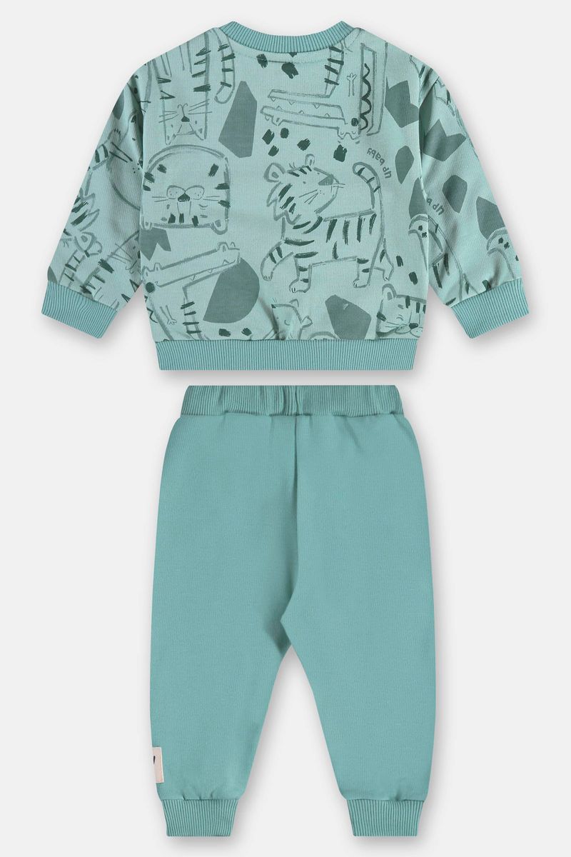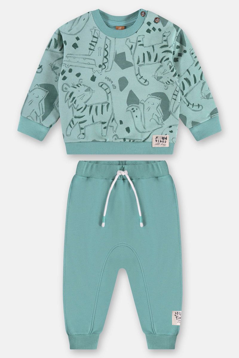 Conjunto para bebê menino, composto por um blusão e uma calça, ambos em moletom (calça em moletom felpado), que unem conforto e estilo para os dias frios. O blusão possui gola redonda, punhos e barra em ribana canelada, uma estampa com diversos ícones e abertura nos ombros com botão e caseado. A calça tem modelagem saruel e conta punhos, cós elástico e cadarço decorativo, garantindo caimento seguro e estiloso.