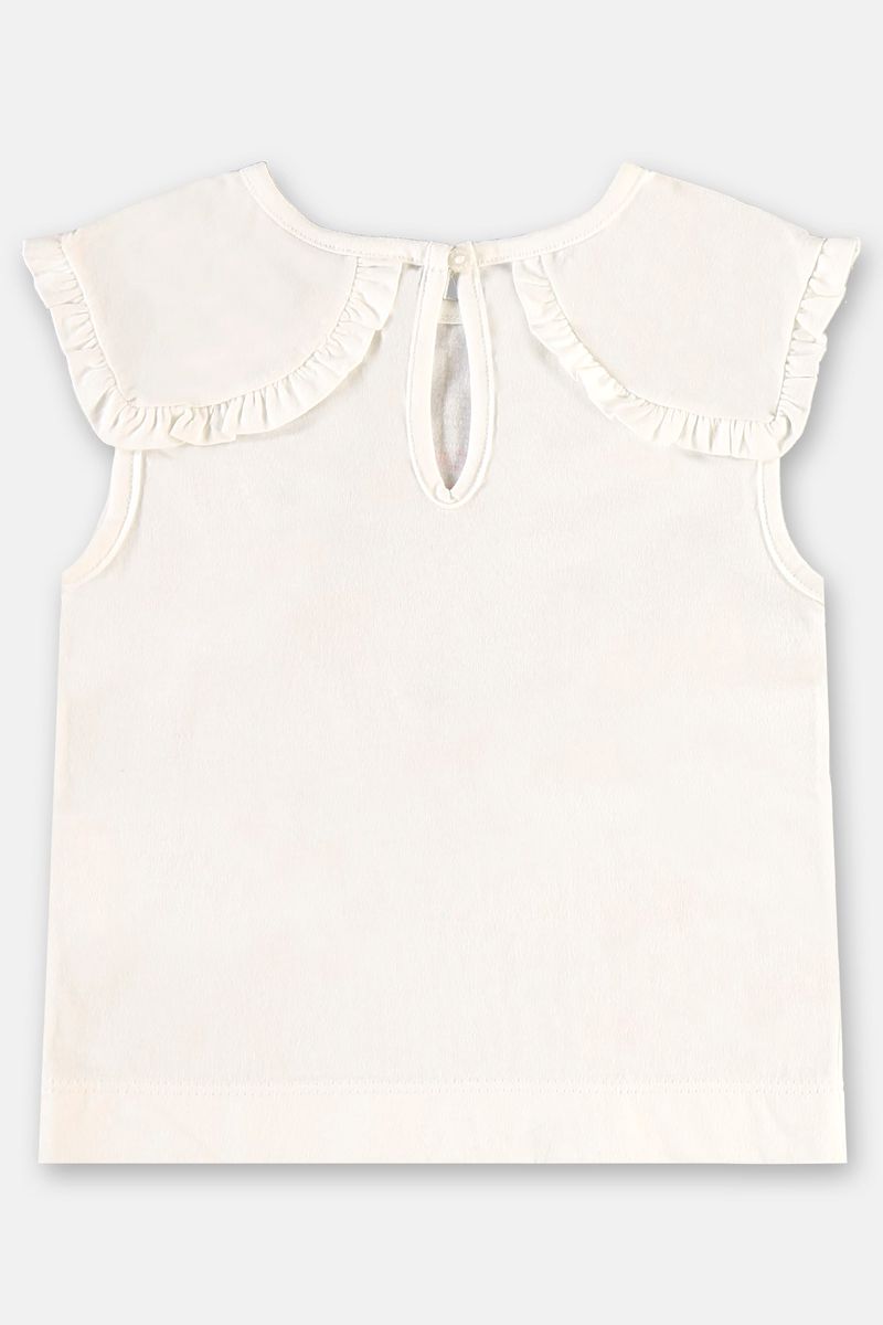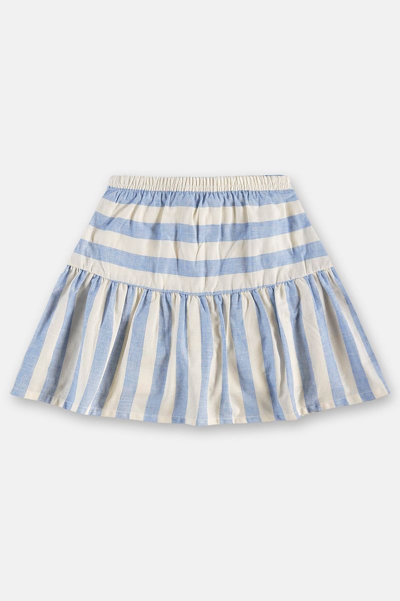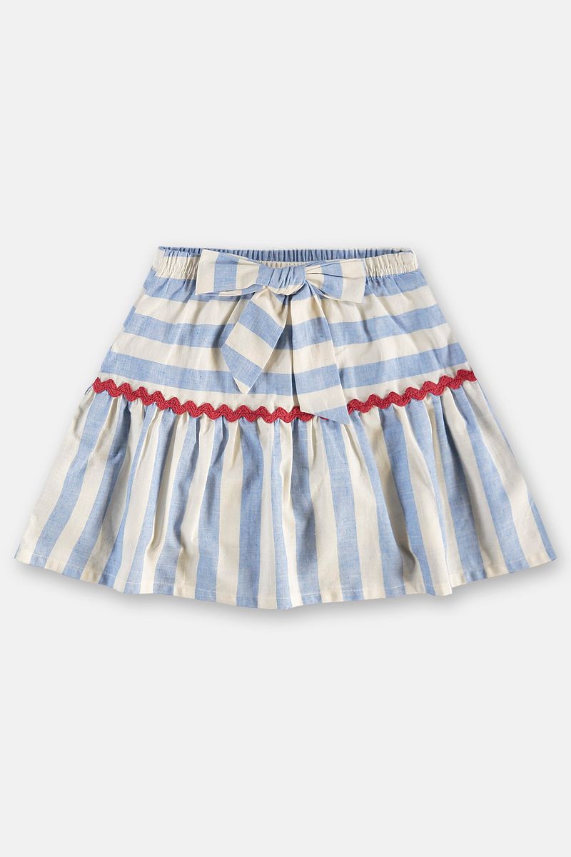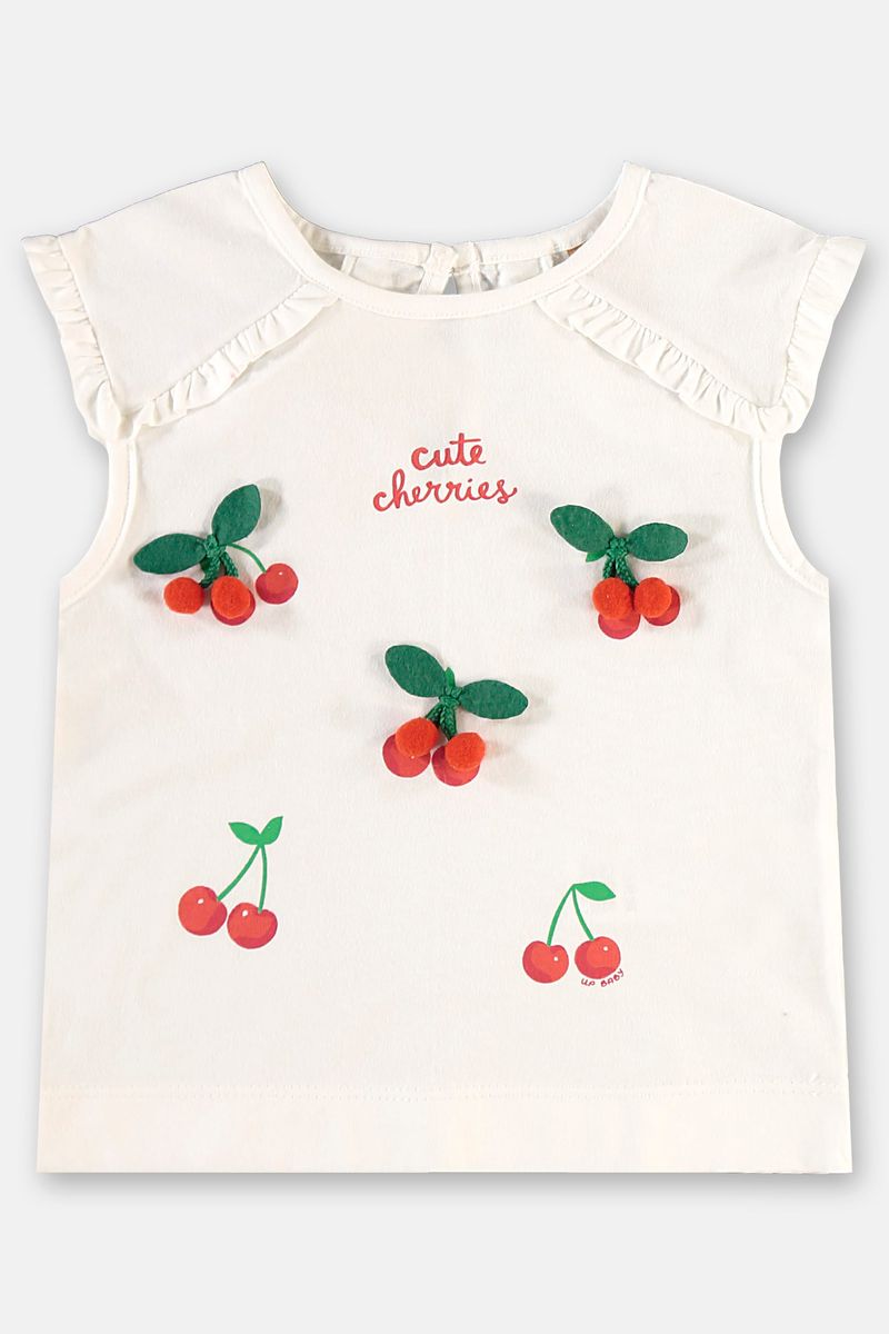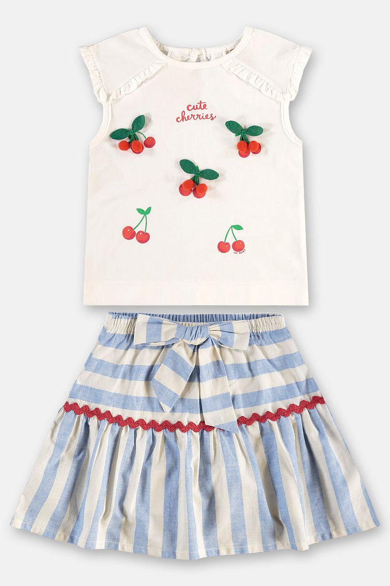 Conjunto para menina composto por blusa em meia malha e saia em tecido listrado de algodão, com short interno embutido. A blusa apresenta recorte com babado franzido nos ombros, abertura em formato de gota com botão e elástico nas costas e estampa frontal de cerejas em aplique 3D, deixando a peça divertida e charmosa. A saia possui recortes franzidos, aplicação de sianinha, laço decorativo e cós com elástico, garantindo caimento confortável. Ideal para passeios e ocasiões casuais.