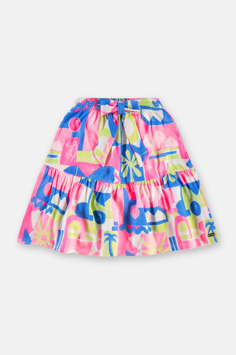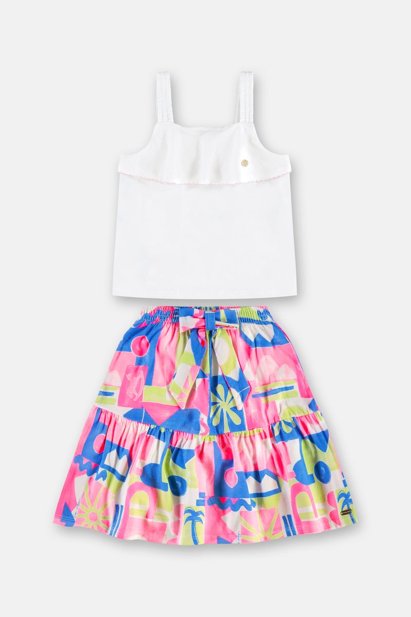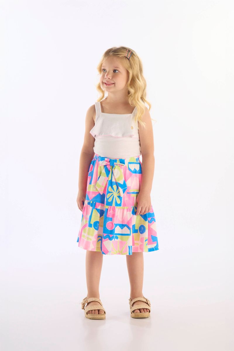 Conjunto Infantil Feminino, confeccionado em algodão, tecido macio e respirável. A blusa possui modelagem leve, possui alças com elástico, plaquinha e bainha, perfeita para acompanhar o verão. A saia em algodão rotativo com estampa digital exclusiva, trazendo modernidade ao look. Contém short interno embutido, que proporciona segurança e liberdade de movimentos para as meninas, possui laço centralizado, elástico na cintura. Conjunto versátil que pode ser usada em passeios, festas ou no dia a dia.