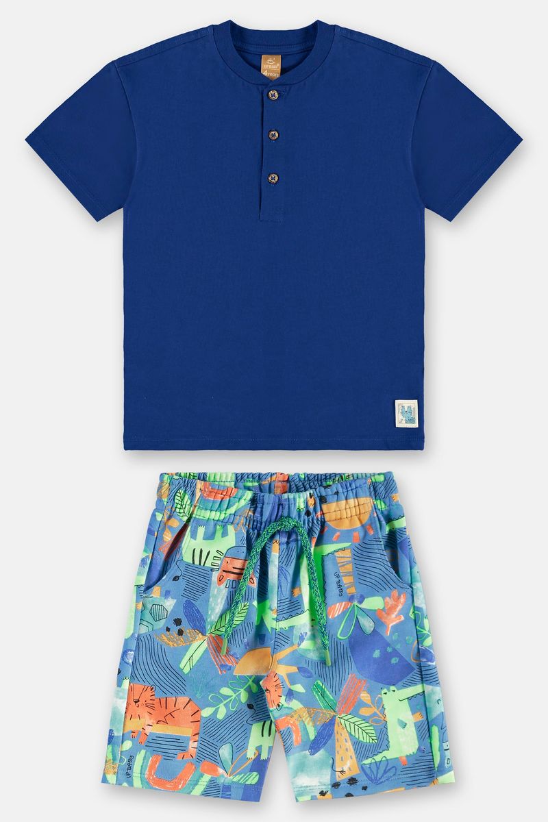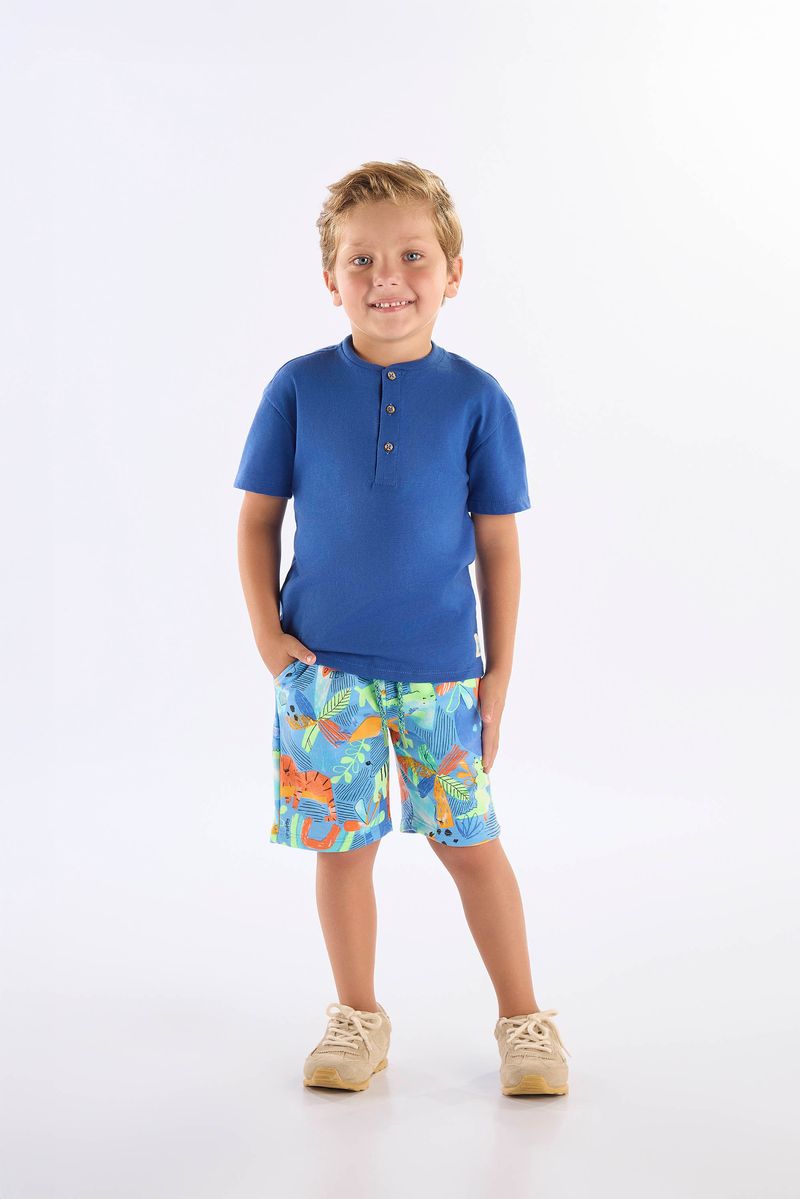 Conjunto para menino, composto por camiseta em meia malha e bermuda em moletom sem felpa, combina leveza e frescor para os dias de verão. A camiseta de manga curta, confeccionada em algodão macio, com gola arredondada em ribana, peitilho com botões decorativos e costura reforçada, além da etiqueta decorativa na parte inferior oferecendo um toque único a peça. Acompanhando a bermuda feita em algodão com poliéster, possui cós com elástico para ajuste ideal, cadarço decorativo, bolso funcional proporcionando praticidade no dia a dia, conta também com estampa rotativa colorida e criativa. Ideal para passeios, brincadeiras e momentos descontraídos.