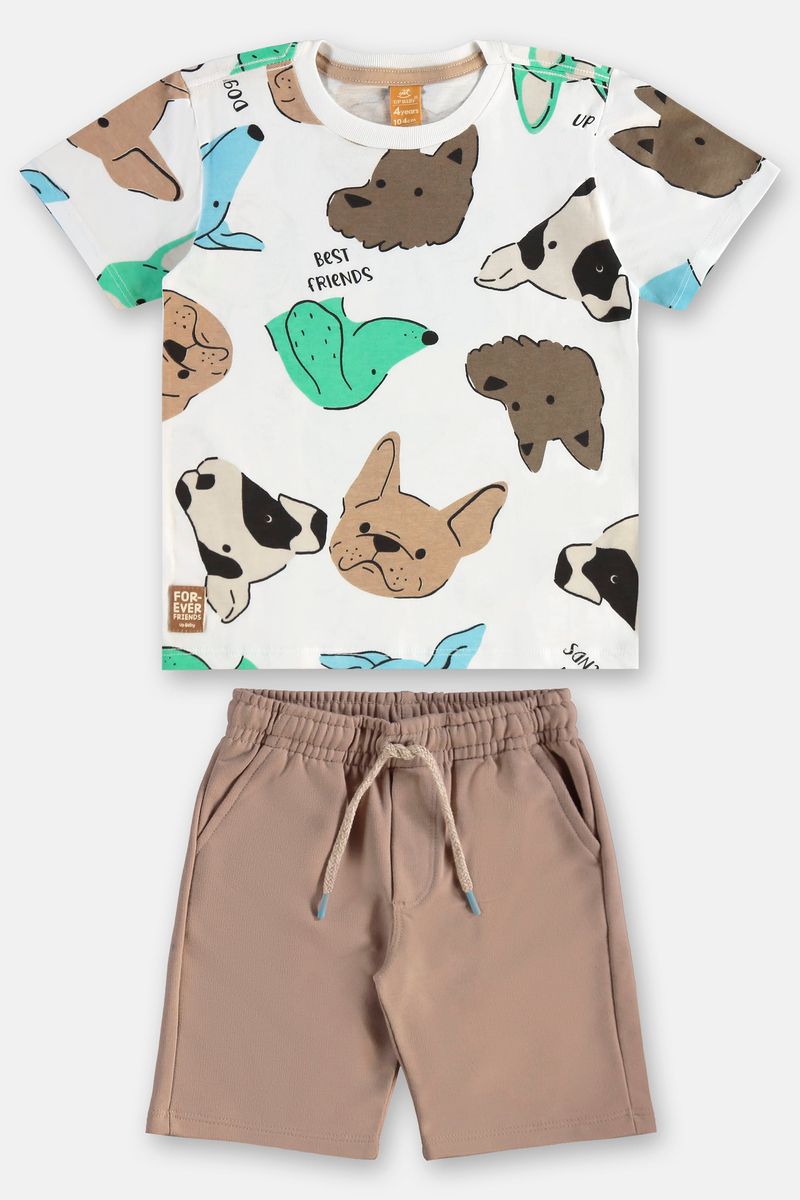 Conjunto infantil, composto por camiseta em meia malha e bermuda em moletom sem felpa, combina conforto e um visual moderno. A camiseta é confeccionada em tecido de algodão, possui gola redonda, mangas curtas, costura reforçada, etiqueta decorativa discreta dando um charme a mais para a peça. O destaque fica por conta da estampa rotativa, com o tema "dog lover", colorida, tornando o look divertido e alegre. Acompanhando a bermuda, feita em algodão com poliéster, oferece liberdade de movimento, possui cós com elástico, braguilha falsa, bolso e cadarço funcional garantindo praticidade no cotidiano. Peça versátil, combina com diferentes ocasiões, desde passeios descontraídos até atividades escolares.