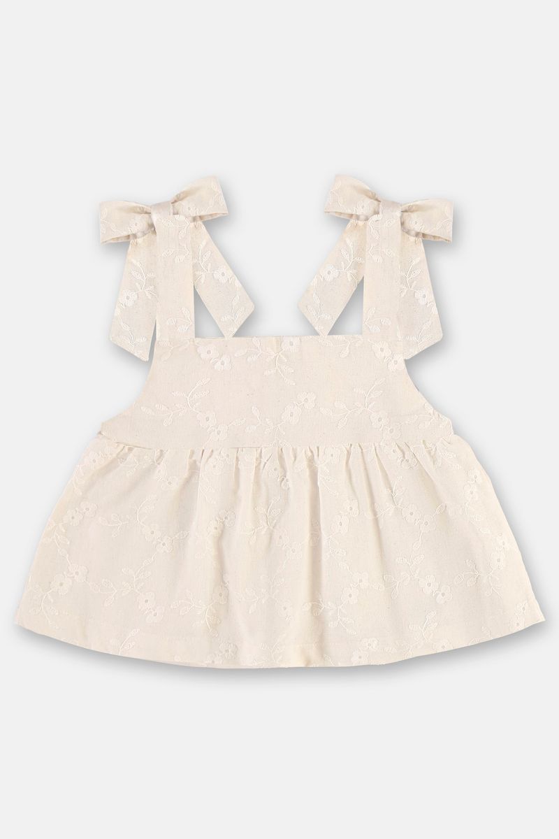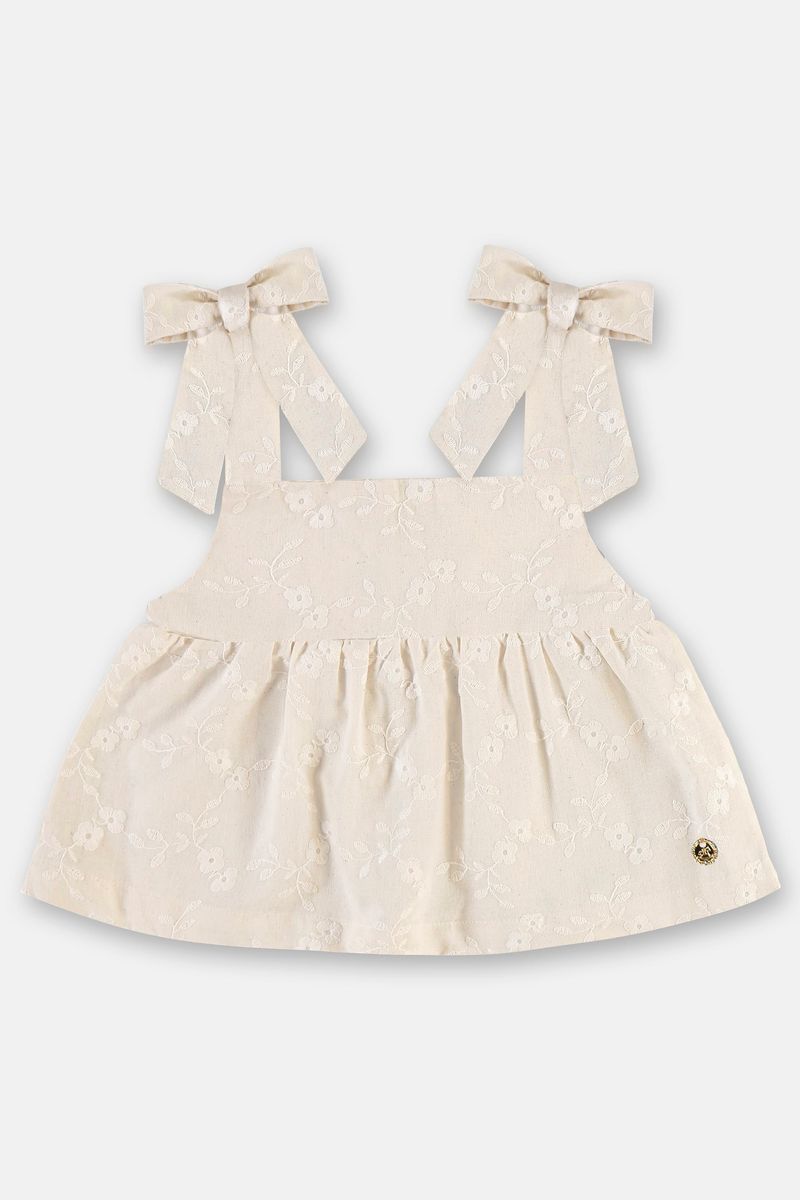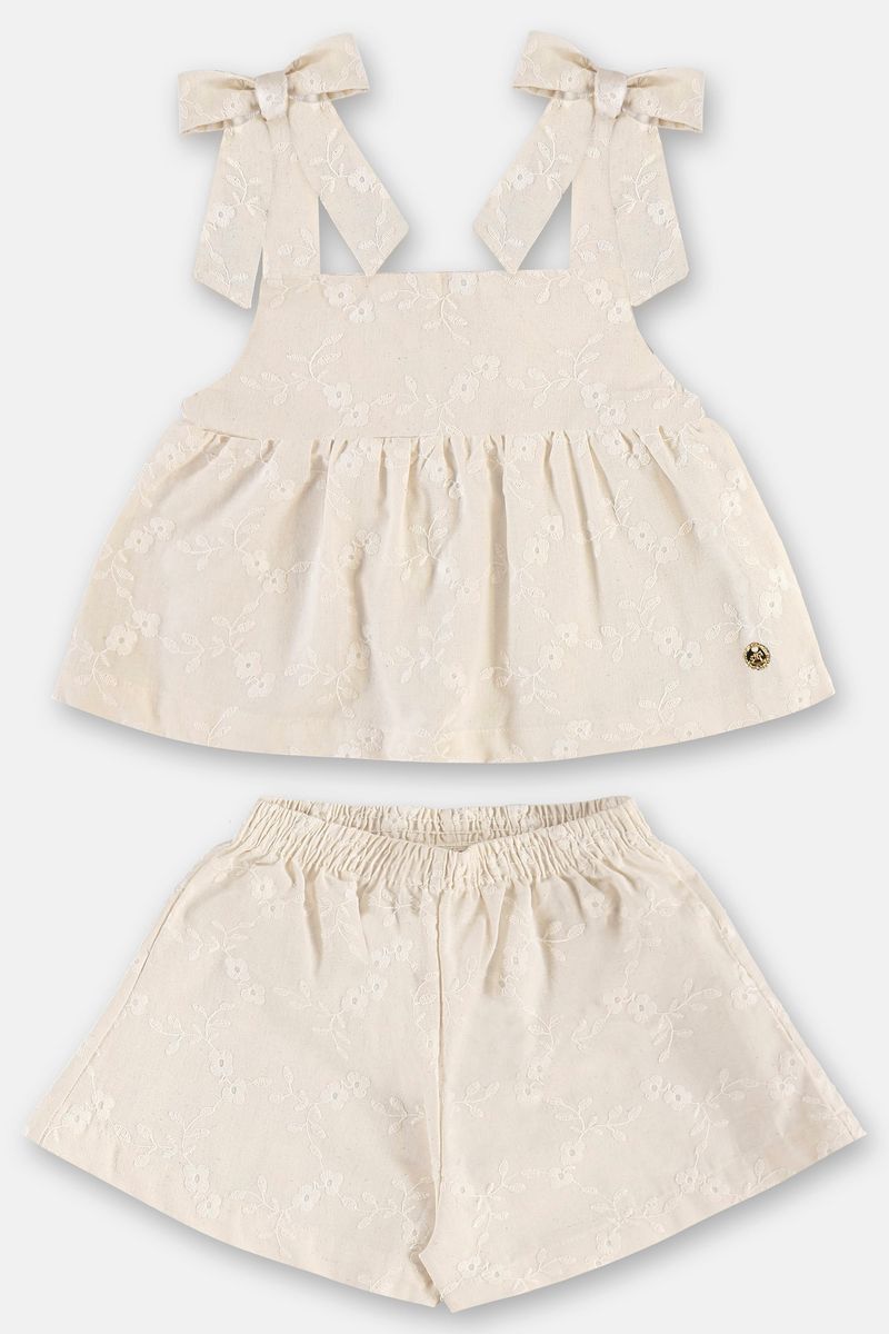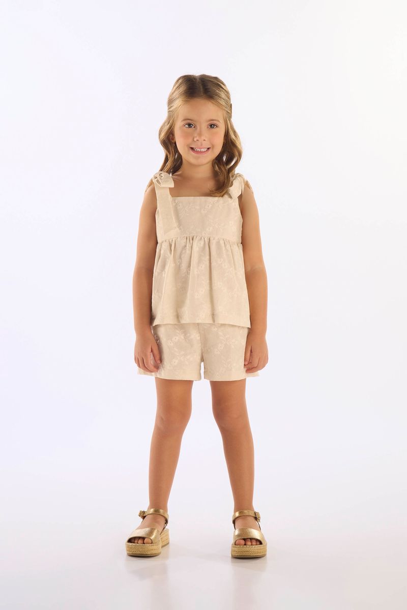Conjunto infantil feminino produzido em algodão bordado, composto por Blusa e short, perfeito para os dias de calor. A Blusa apresenta alças em laço, pala dupla tanto na parte frontal quanto nas costas e recortes franzidos que dão um toque delicado. O short traz cós com elástico, garantindo conforto e praticidade durante as brincadeiras. Um conjunto delicado que combina estilo e bem-estar para as meninas.