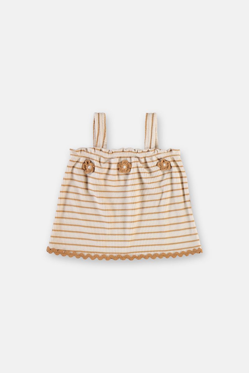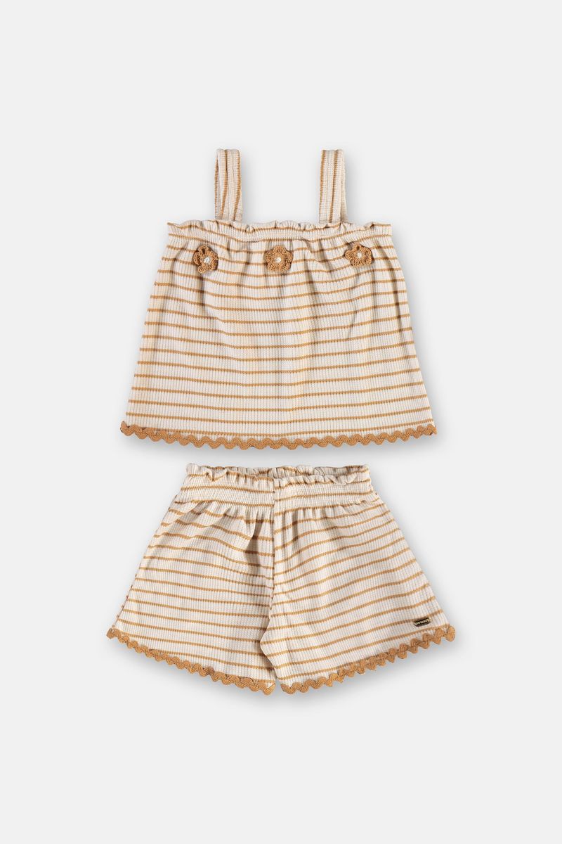 • Conjunto infantil feminino confeccionado em malha listrada de poliéster, algodão e viscose. Leve e confortável, é ideal para os dias mais quentes. A bata possui alças largas com elástico interno, decote com elástico, detalhe em sianinha e aplicação de flor em crochê, que acrescenta delicadeza à peça. O short apresenta cós elástico e acabamento em sianinha na barra, garantindo estilo e liberdade de movimentos. Uma opção perfeita para passeios, eventos casuais e momentos de lazer.