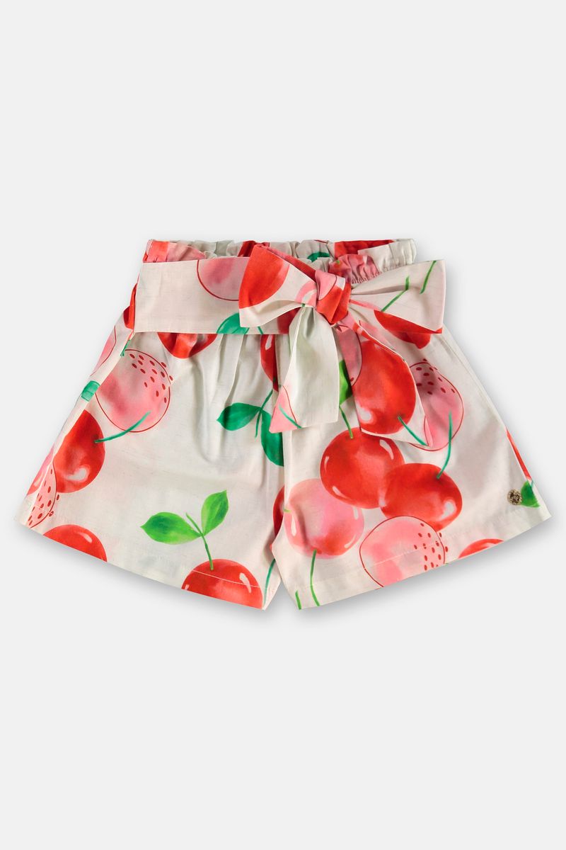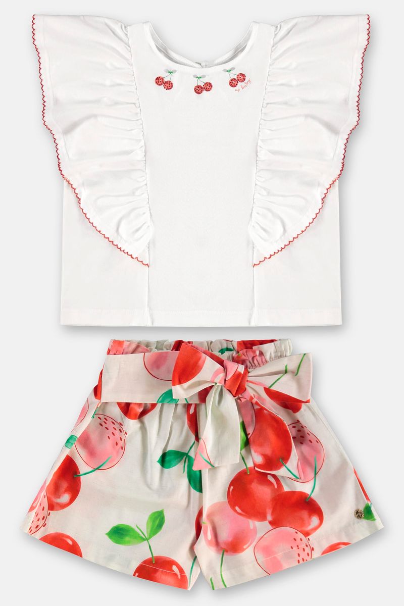 Conjunto para menina composto por blusa em algodão e short produzido em tecido com viscose e linho, conforto e frescor garantido. A blusa possui franzido, estampa delicada com strass e acabamento refinado, além de leve abertura nas costas com botão, um detalhe que oferece delicadeza e charme. Já o short em tecido respirável conta com elástico na cintura, faixa para amarração frontal e plaquinha decorativa oferecendo exclusividade a peça. A estampa de cerejas, cheia de cor entra em destaque por proporcionar um toque alegre e divertido. Perfeito para passeios, encontros em família e momentos de lazer com muito charme.
