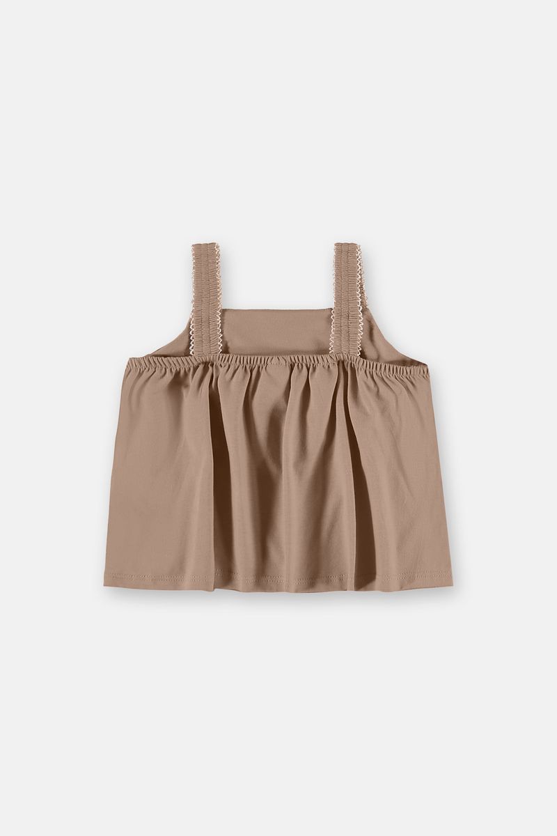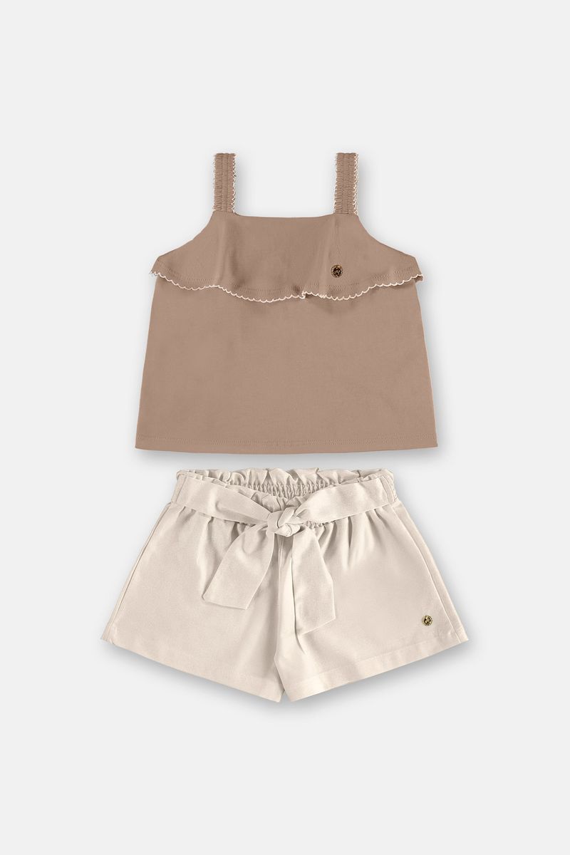Conjunto para menina composto por regata em meia malha e short em tecido com linho. A regata apresenta alças com acabamento delicado e elástico interno, além de parte sobreposta. O short possui cós clochard com elástico embutido e faixa decorativa, garantindo ajuste confortável e visual moderno. Uma opção sofisticada e prática para os dias de verão.