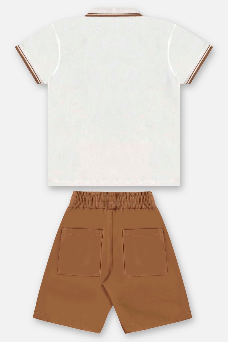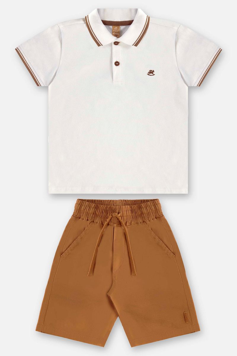 Conjunto infantil para menino com camisa polo em malha piquet (algodão e elastano) e bermuda em sarja (algodão e elastano), ideal tanto para atividades casuais quanto para eventos especiais. A camisa possui gola e punhos em retilínea, peitilho com botões e bordado com o ícone da marca no peito. A bermuda conta com cós elástico, cordão funcional, bolsos, braguilha decorativa e efeito lavanderia, processo que cria uma variedade de efeitos visuais e texturas.