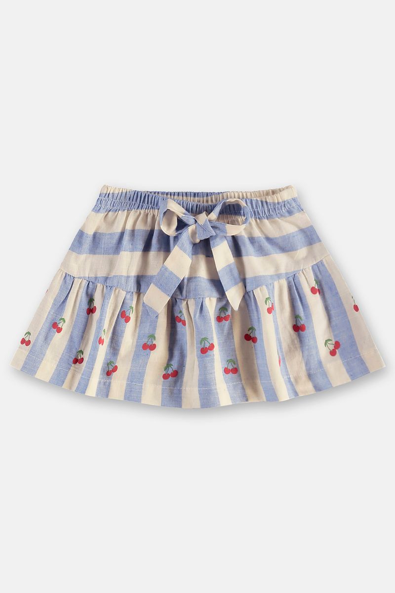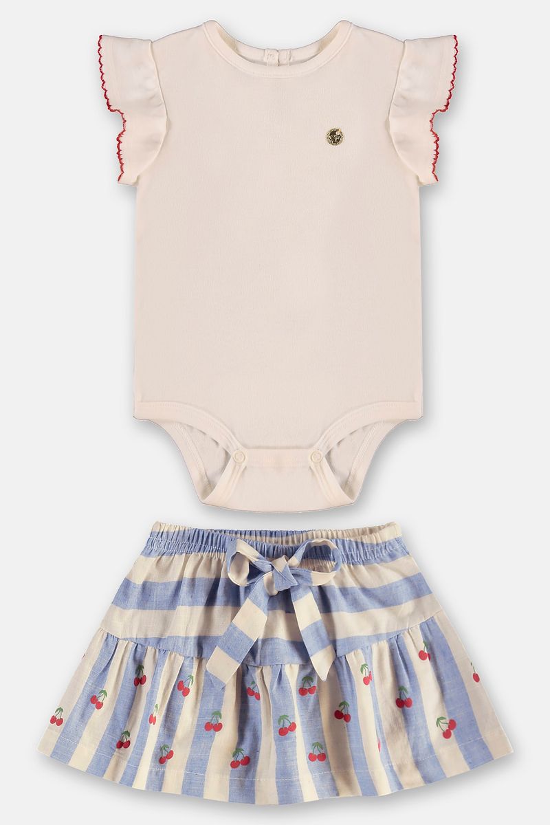 Conjunto para bebê menina, ideal para compor looks delicados e confortáveis nos dias mais quentes. O body, confeccionado em suedine de algodão, tem toque macio e possui mangas franzidas. Para facilitar as trocas, conta com abertura entrepernas por botões de pressão e um charmoso recorte em gota nas costas. Acompanha uma saia em tecido listrado de algodão, que se destaca pelo franzido total, pela estampa e pela faixa que forma um laço na cintura, criando um visual fofo e sofisticado.