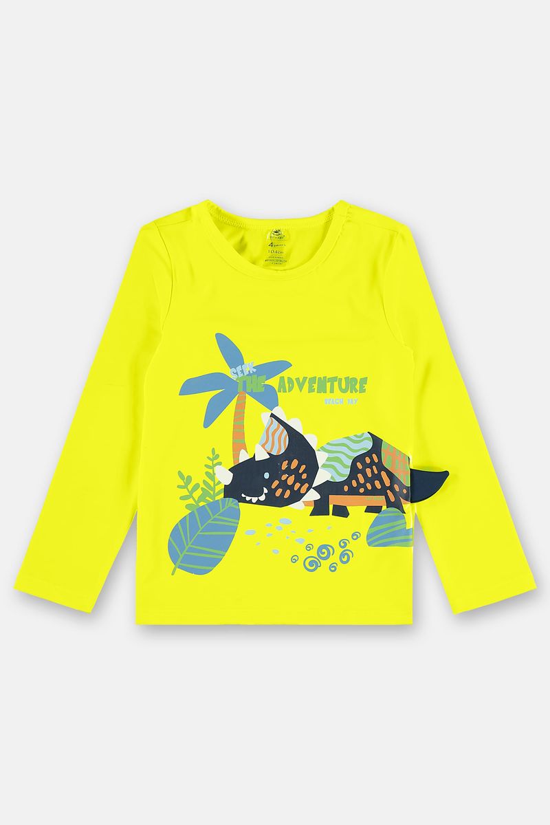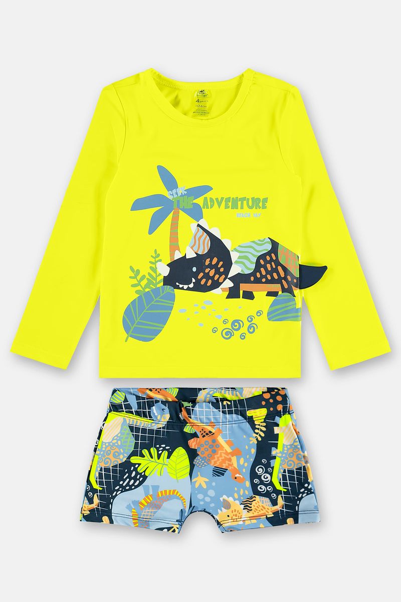 Conjunto para menino, diversão e proteção garantidas, composto por camiseta com proteção UV FPS+50 e sunga boxer, em tecido de poliéster com elastano. A camiseta de manga longa, oferece cobertura adicional e conforto, possui costura reforçada e estampa criativa com aplique como complemento. Já a sunga conta com forro interno em poliamida para maior segurança e refresco, possui elástico na cintura, além da estampa colorida e divertida, garantindo um toque alegre ao look. Um conjunto prático e estiloso para aproveitar os dias de verão na praia ou na piscina.