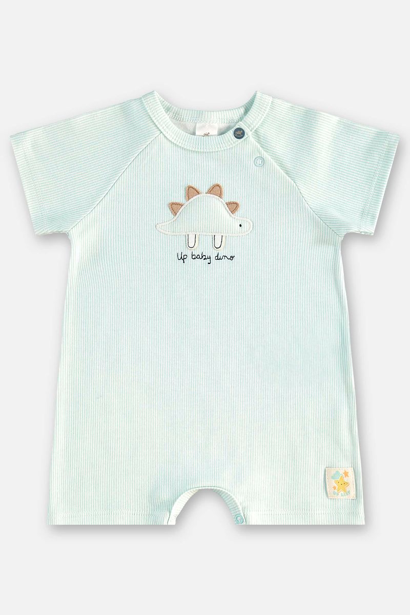 Macaquinho para bebê menino, confeccionado em suedine, com toque macio e confortável para o uso diário. Possui estampa listrada moderna e bordado delicado de dinossauro, que dá um charme especial à peça. Os botões de pressão no ombro e entre as pernas facilitam o vestir e a troca, oferecendo praticidade e funcionalidade no dia a dia.