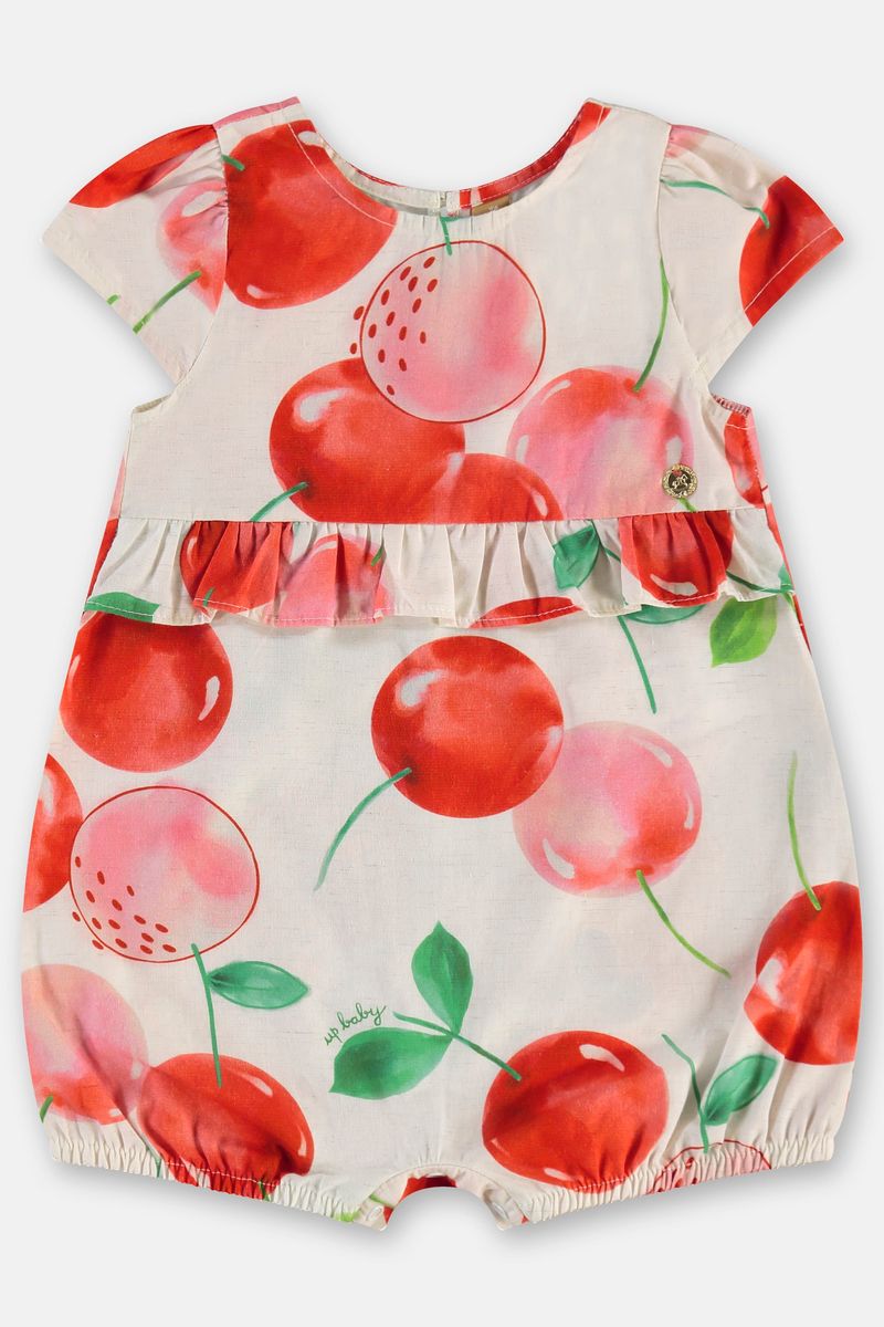 Macaquinho para menina combina delicadeza e conforto, confeccionado em tecido macio de viscose e linho, oferecendo toque suave com frescor nos dias de calor. Conta com manga curta franzida, recorte na cintura com babado embutido, plaquinha personaliza um detalhe exclusivo para a peça, além da abertura por botões de pressão proporcionando praticidade no dia a dia. O destaque fica por conta da estampa de cerejas coloridas, com um toque alegre e criativo. Um look leve, confortável e cheio de estilo para acompanhar a bebê com liberdade de movimento durante todo o dia.