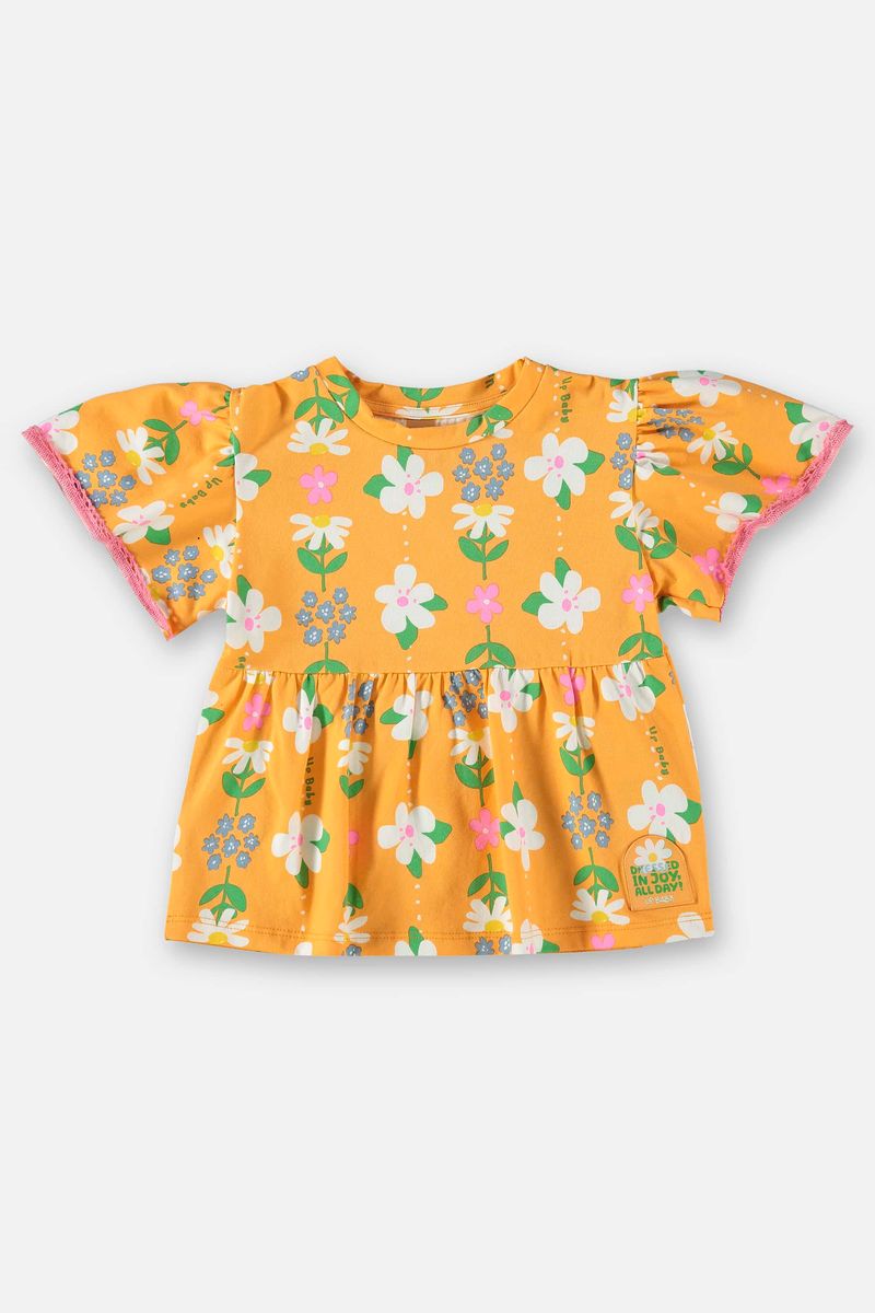 Bata infantil para meninas, confeccionada em cotton (uma suave mistura de algodão e elastano), garantindo conforto e estilo. Destaca-se pela gola redonda e pela elegante manga com franzido e aviamento, além disso, possui recorte próximo a altura do peito e estampa rotativa pela peça completa.