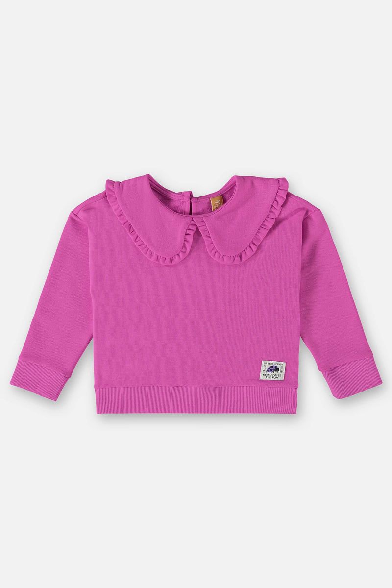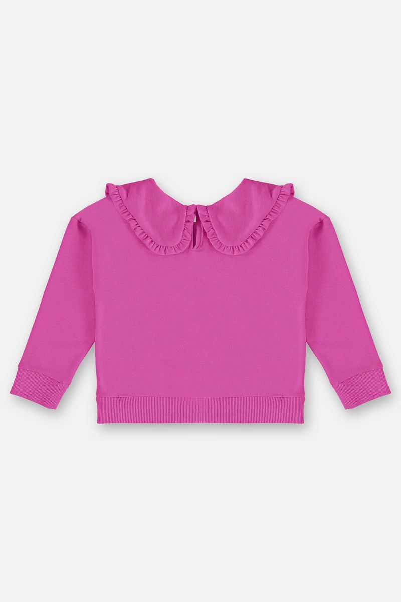 Blusão infantil para meninas, confeccionado em moletom sem felpa. Possui gola com babados e franzidos, abertura em formato de gota por botão e elástico nas costas, além de punhos e barra.
