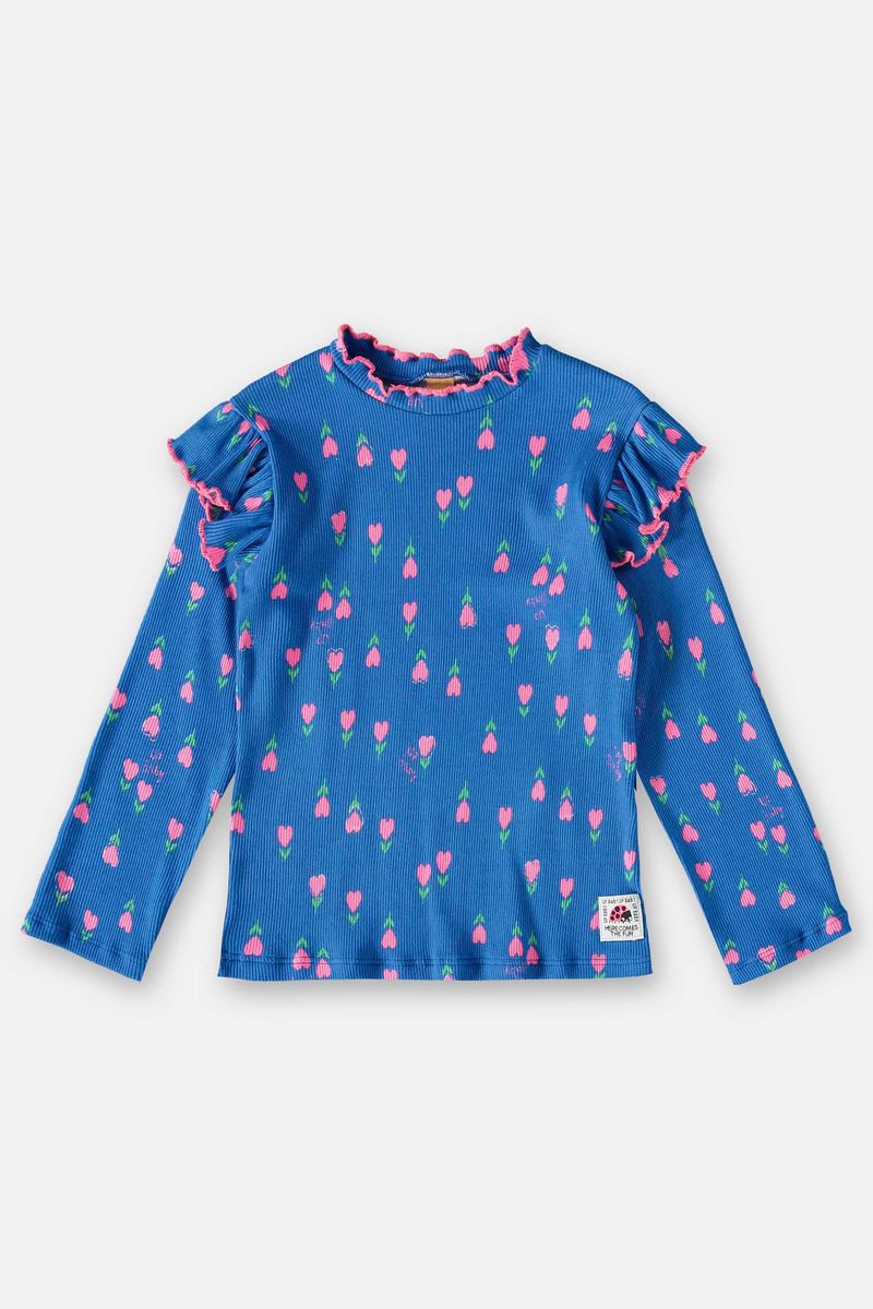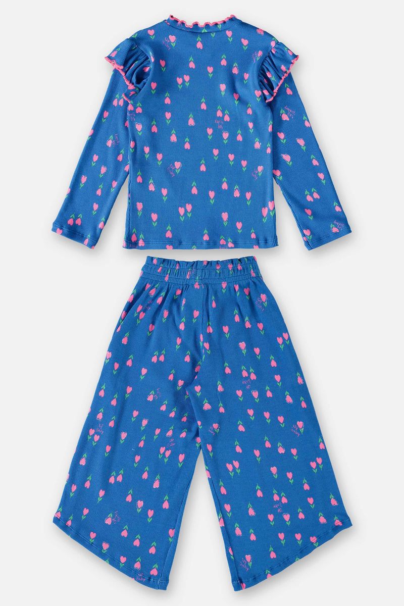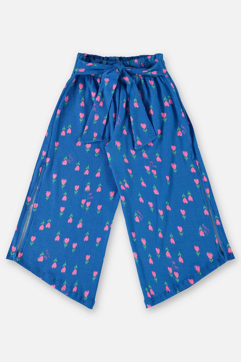 Conjunto infantil Menina composto por uma blusa e uma calça em ribana, uma escolha que combina estilo, conforto e detalhes delicados para as pequenas. A blusa é estampada, conta com babados franzidos com acabamento em fru-fru nos ombros e na gola. A calça conta com uma faixa presa nas laterais, que forma um acabamento em nó na parte frontal, e abertura lateral nas pernas, um detalhe funcional que facilita o vestir e dá um charme a mais na peça.