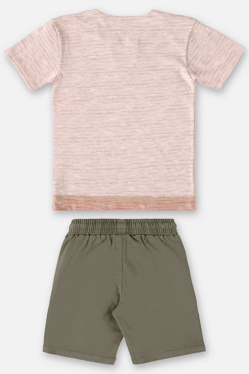 Conjunto infantil para meninos, composto por uma Camiseta em malha flamê e por uma Bermuda em sarja com elastano. A Camiseta possui gola com revel do avesso, peitilho e efeito lavanderia, que cria texturas diferenciadas na peça. A Bermuda conta com cós com elástico e cadarço na cintura, bolsos funcionais com lapela decorativa e sobreposto.