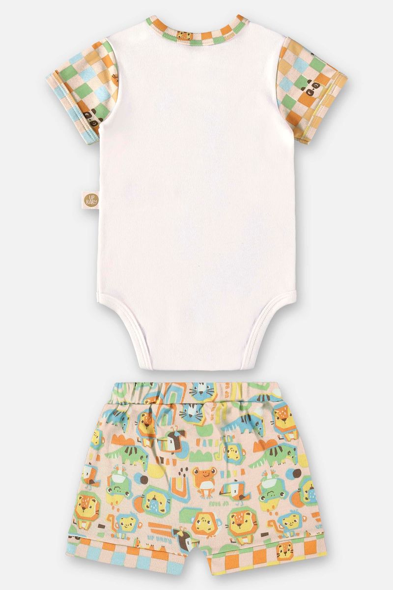 Conjunto unissex para bebê, composto por um Body e um shorts, ambos confeccionados em suedine para máximo conforto. O Body apresenta gola redonda com abertura por botões de pressão no ombro, mangas curtas estampadas, estampa com puff e abertura entre as pernas com botões de pressão para facilitar as trocas. O Short possui cós elástico com cadarço decorativo e ponteiras de corino, além de punhos ajustados e uma estampa que complementa perfeitamente a do Body. Ideal para manter seu bebê estiloso e confortável em qualquer ocasião.