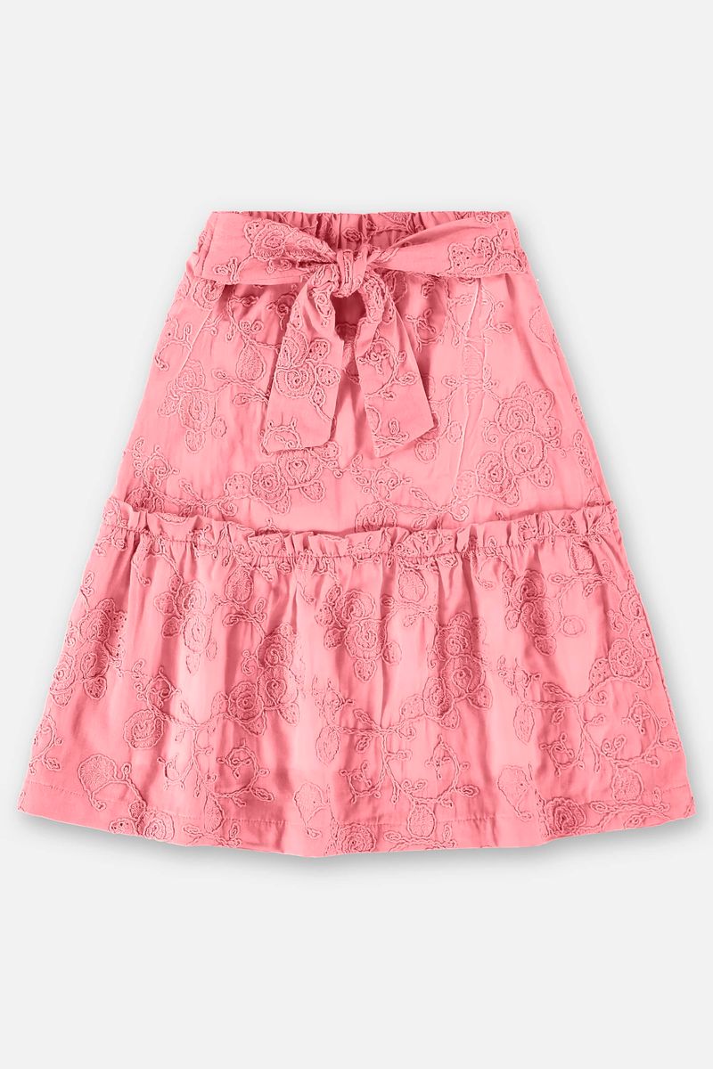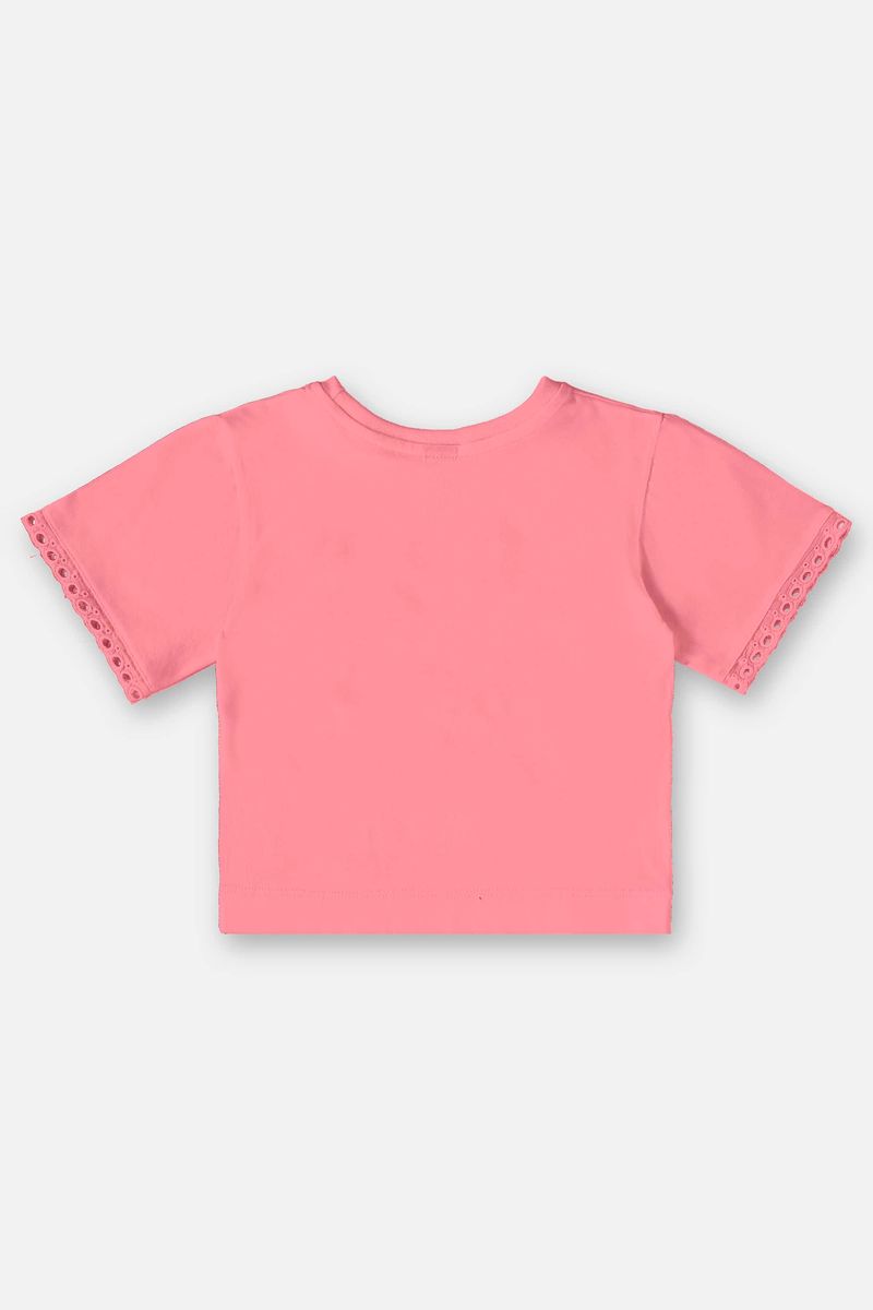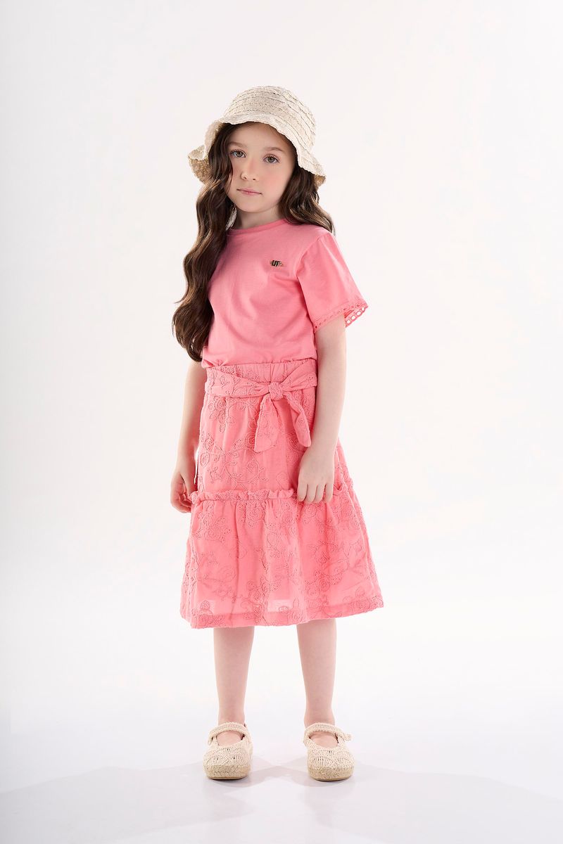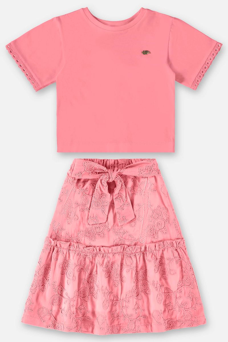 Conjunto infantil para meninas, composto por uma blusa confeccionada em meia malha e uma saia em laise. A blusa possui gola redonda em ribana, manga curta com aviamento em renda e plaquinha personalizada da marca. A saia possui cós com elástico na cintura com renda e forro em meia malha, Faixa dupla em formato de nó e babado sobreposto.
