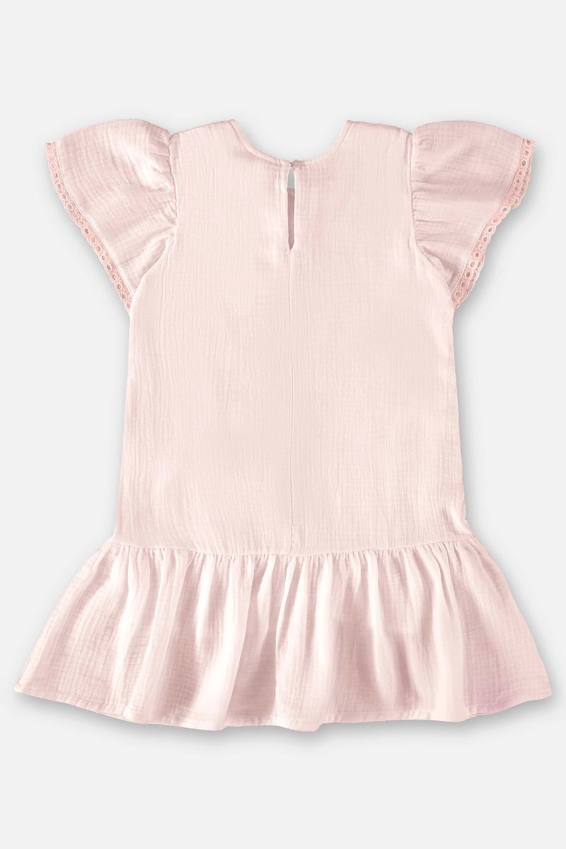 Vestido infantil confeccionado em tecido laise, composto por algodão e com forro em meia malha, também em algodão. Possui gola redonda, mangas com franzido e aviamento renda aplicado, recorte com franzido frente e costas abaixo da linha da cintura, além disso, possui fenda nas costas com botão e elástico.