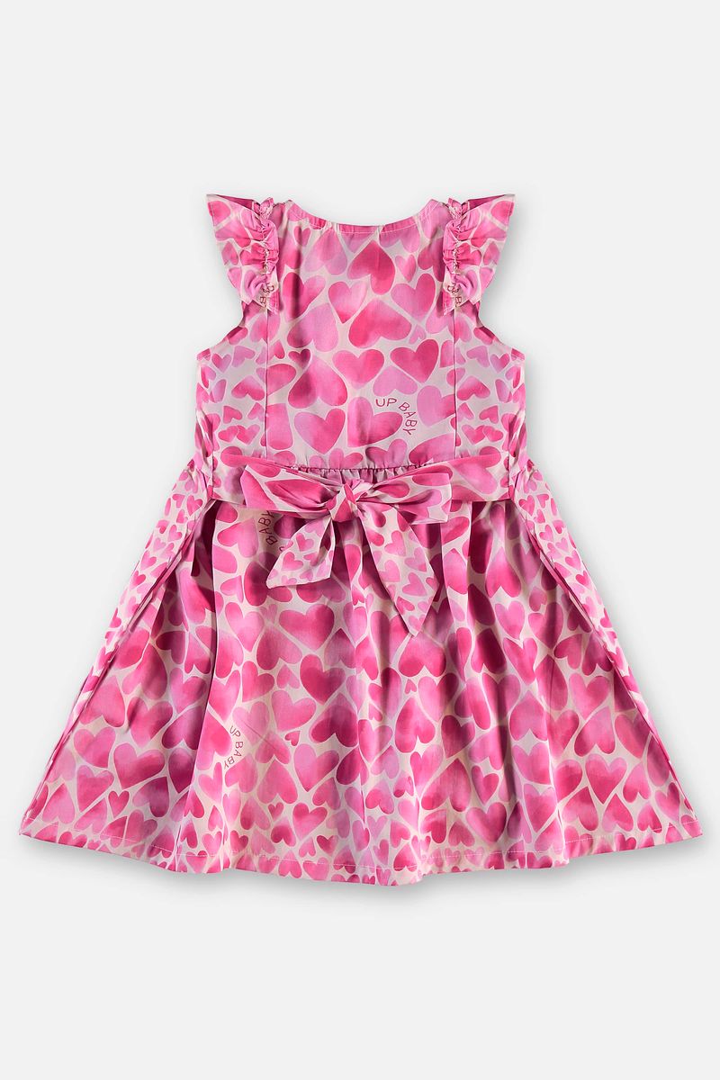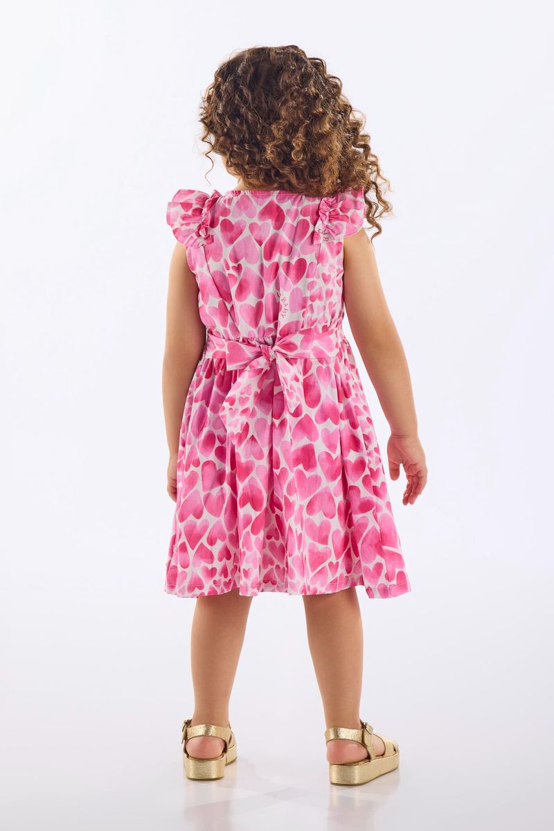 Vestido infantil confeccionado em algodão com estampa digital de corações. Possui babado delicado nos ombros, recorte com franzido na saia e faixa dupla embutida nas costas que forma um charmoso laço. A peça conta ainda com vista funcional frontal com botões em formato de coração e caseados. Um look encantador para dias especiais, passeios ou momentos de diversão com muito estilo.