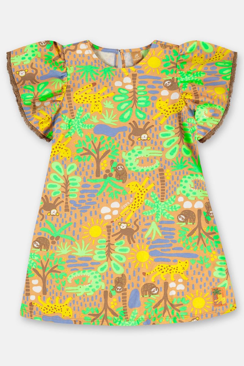 Vestido infantil confeccionado em meia malha (algodão), tecido macio que garante conforto no dia a dia. Tem modelagem soltinha, comprimento acima do joelho e mangas evasê franzidas com renda aplicada, que adicionam delicadeza e charme. Nas costas, conta com abertura em formato de gota com botão e elástico, facilitando o vestir. Com estampas alegres e coloridas, é ideal para passeios, momentos de lazer e ocasiões casuais, unindo estilo e bem-estar para a pequena.