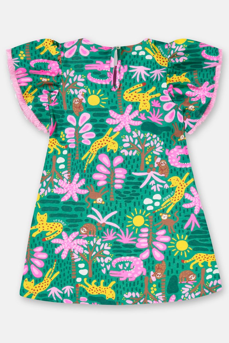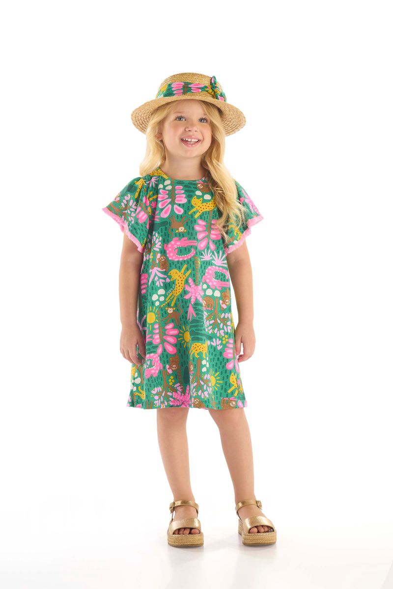 Vestido infantil confeccionado em meia malha (algodão), tecido macio que garante conforto no dia a dia. Tem modelagem soltinha, comprimento acima do joelho e mangas evasê franzidas com renda aplicada, que adicionam delicadeza e charme. Nas costas, conta com abertura em formato de gota com botão e elástico, facilitando o vestir. Com estampas alegres e coloridas, é ideal para passeios, momentos de lazer e ocasiões casuais, unindo estilo e bem-estar para a pequena.