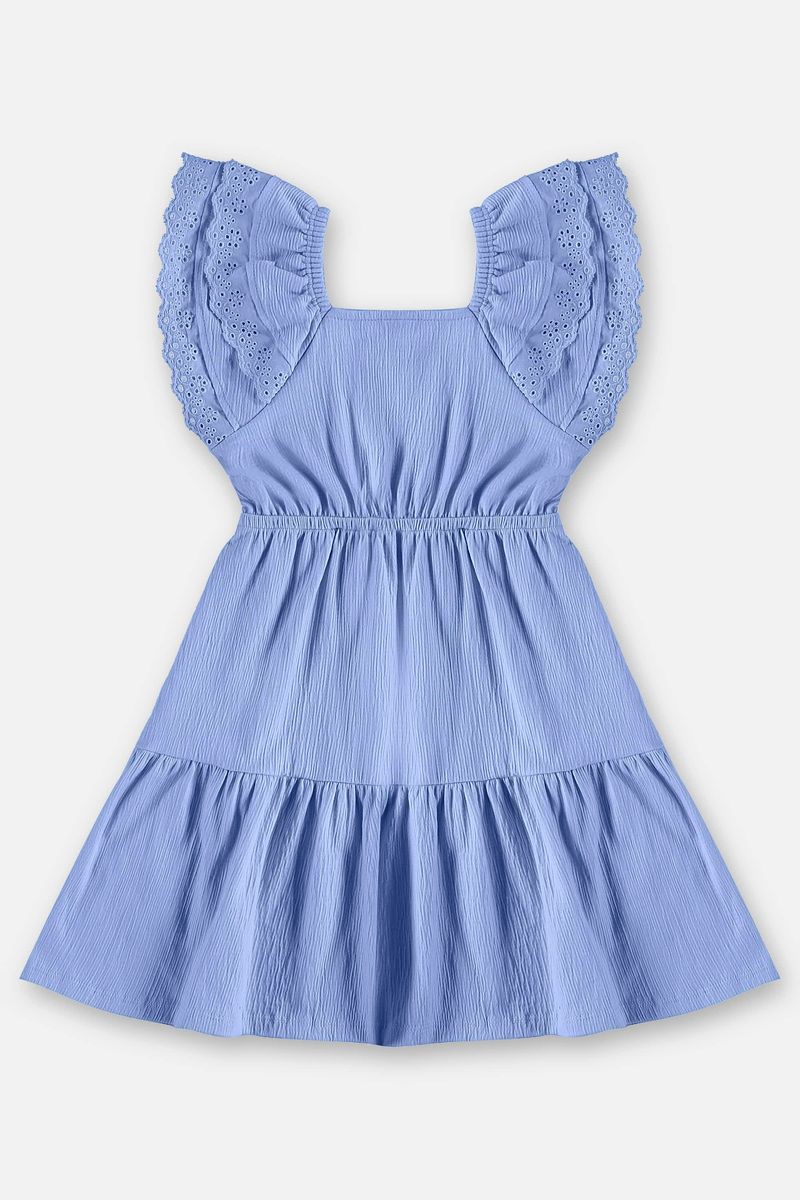 • Vestido infantil confeccionado em cotton texturizado (algodão com elastano), com textura suave que garante conforto e estilo. Possui mangas curtas sobrepostas com aplicação de renda, recorte franzido na saia, e elástico e cordão decorativo com tassel na cintura. Peça perfeita para ocasiões especiais ou até mesmo para o dia a dia.