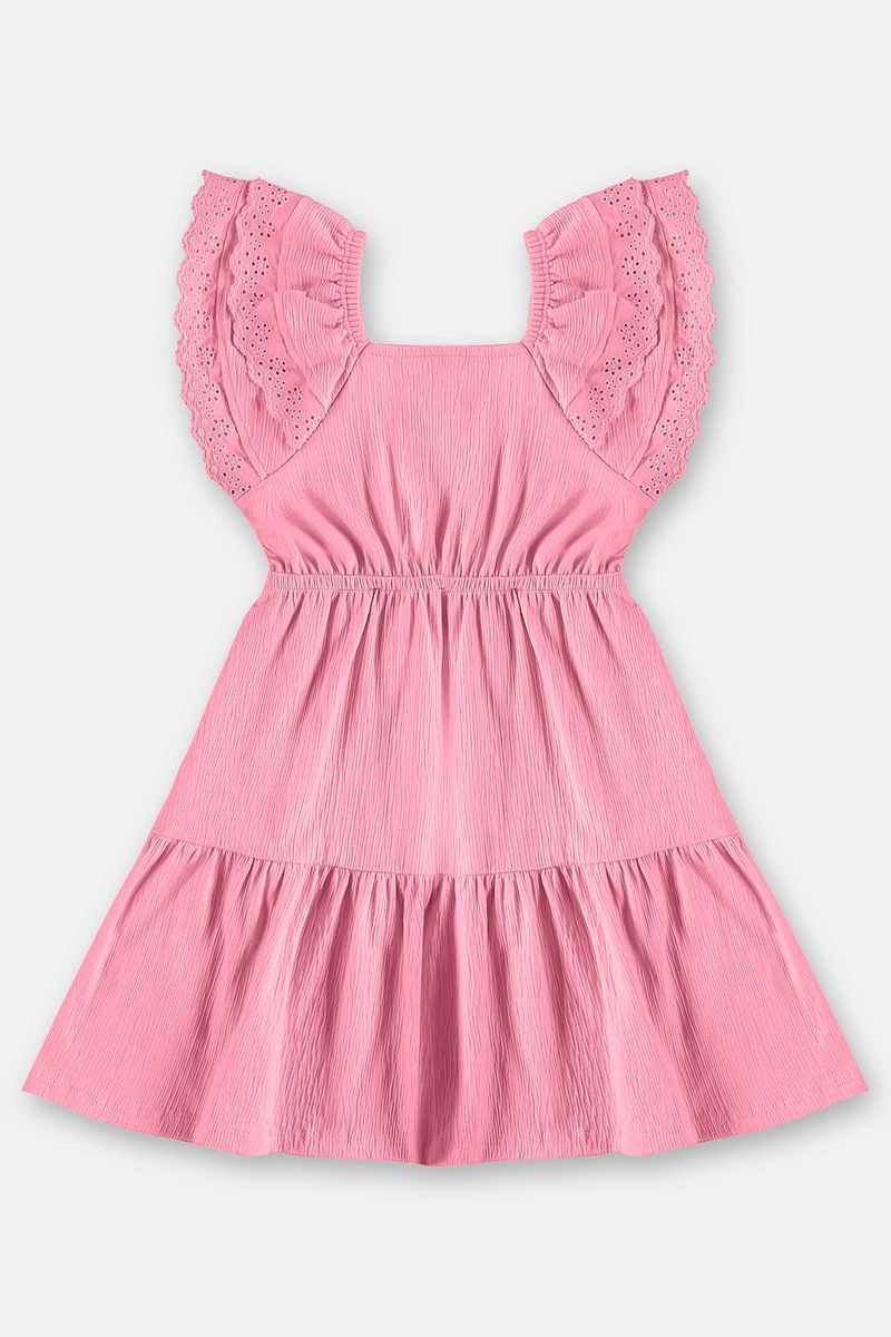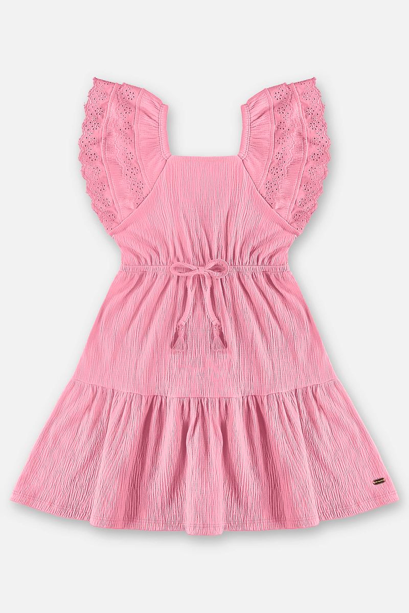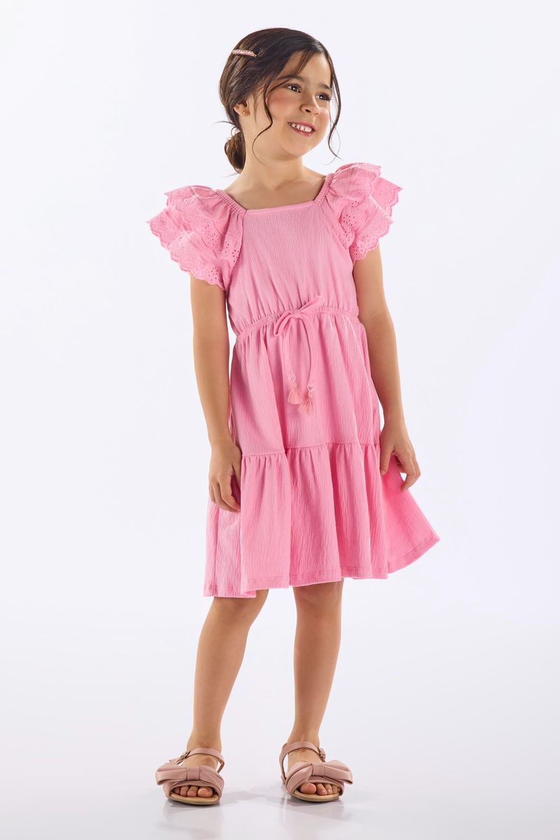 Vestido infantil confeccionado em cotton texturizado (algodão com elastano), com textura suave que garante conforto e estilo. Possui mangas curtas sobrepostas com aplicação de renda, recorte franzido na saia, e elástico e cordão decorativo com tassel na cintura. Peça perfeita para ocasiões especiais ou até mesmo para o dia a dia.