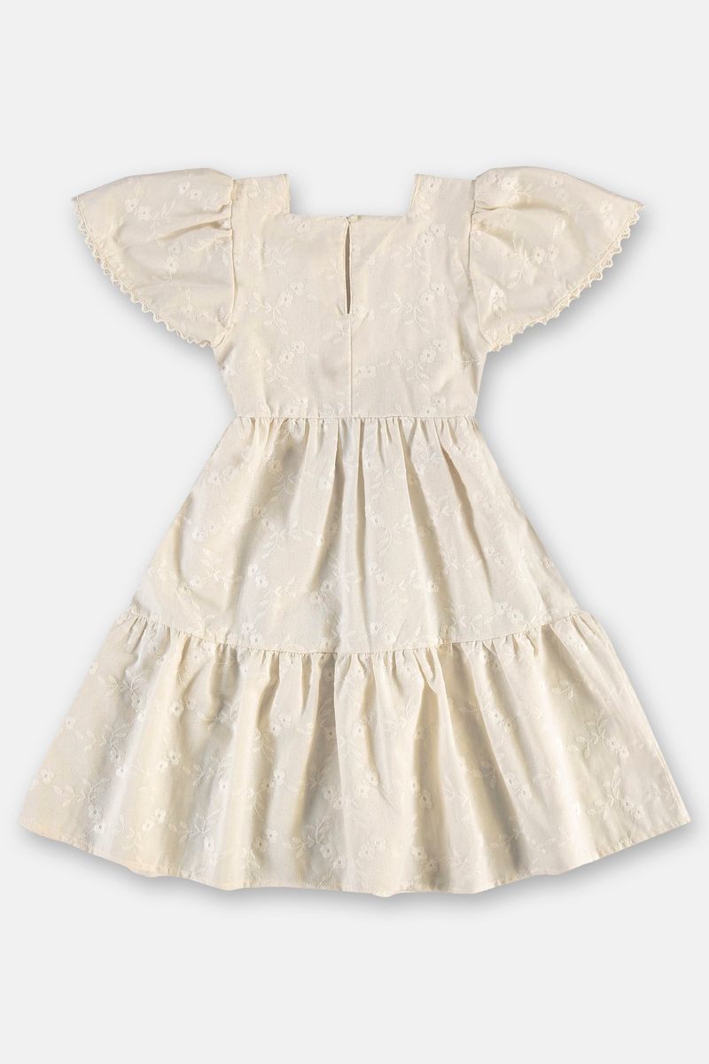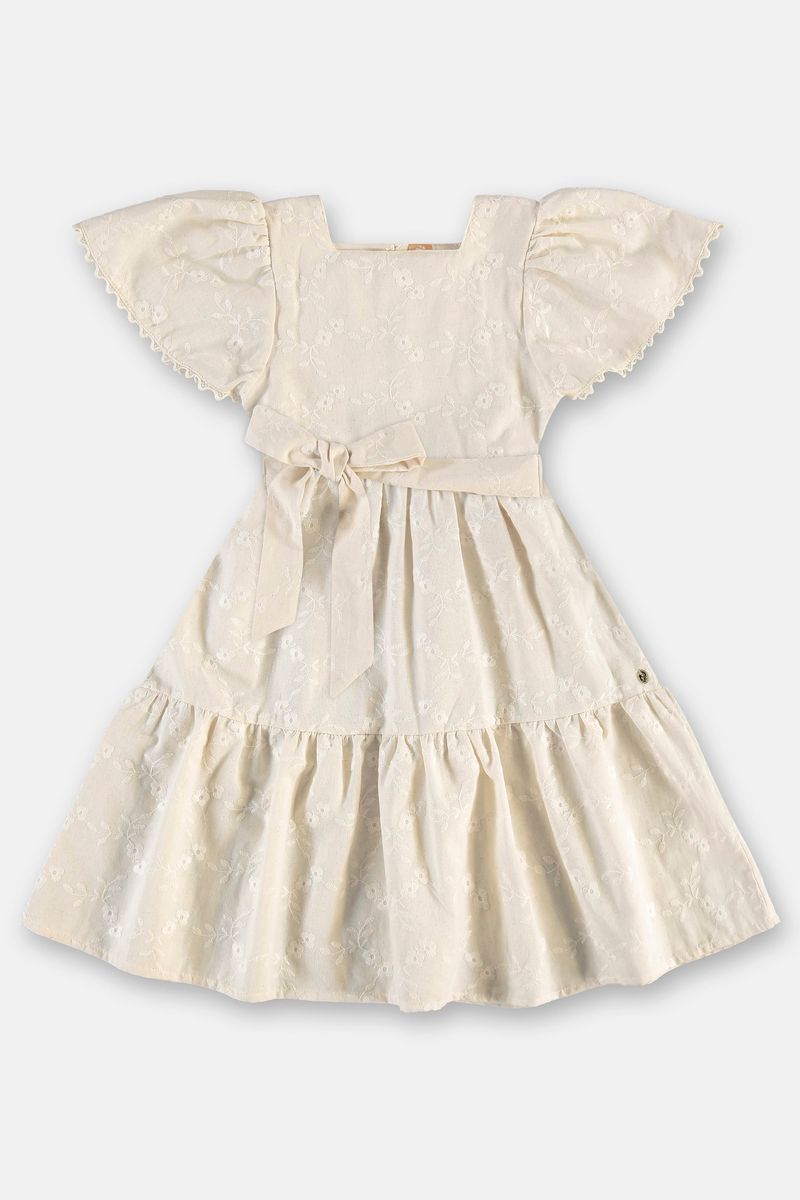 Este vestido midi infantil é confeccionado em tecido de algodão bordado e possui forro em meia malha, proporcionando suavidade ao toque. Com mangas sino levemente franzidas e detalhe em renda, o modelo une conforto e delicadeza. A cintura marcada com faixa dupla e laço fixo valoriza o visual. Já os recortes franzidos garantem movimento e caimento leve. Uma peça versátil, ideal para festas ou momentos especiais no verão.