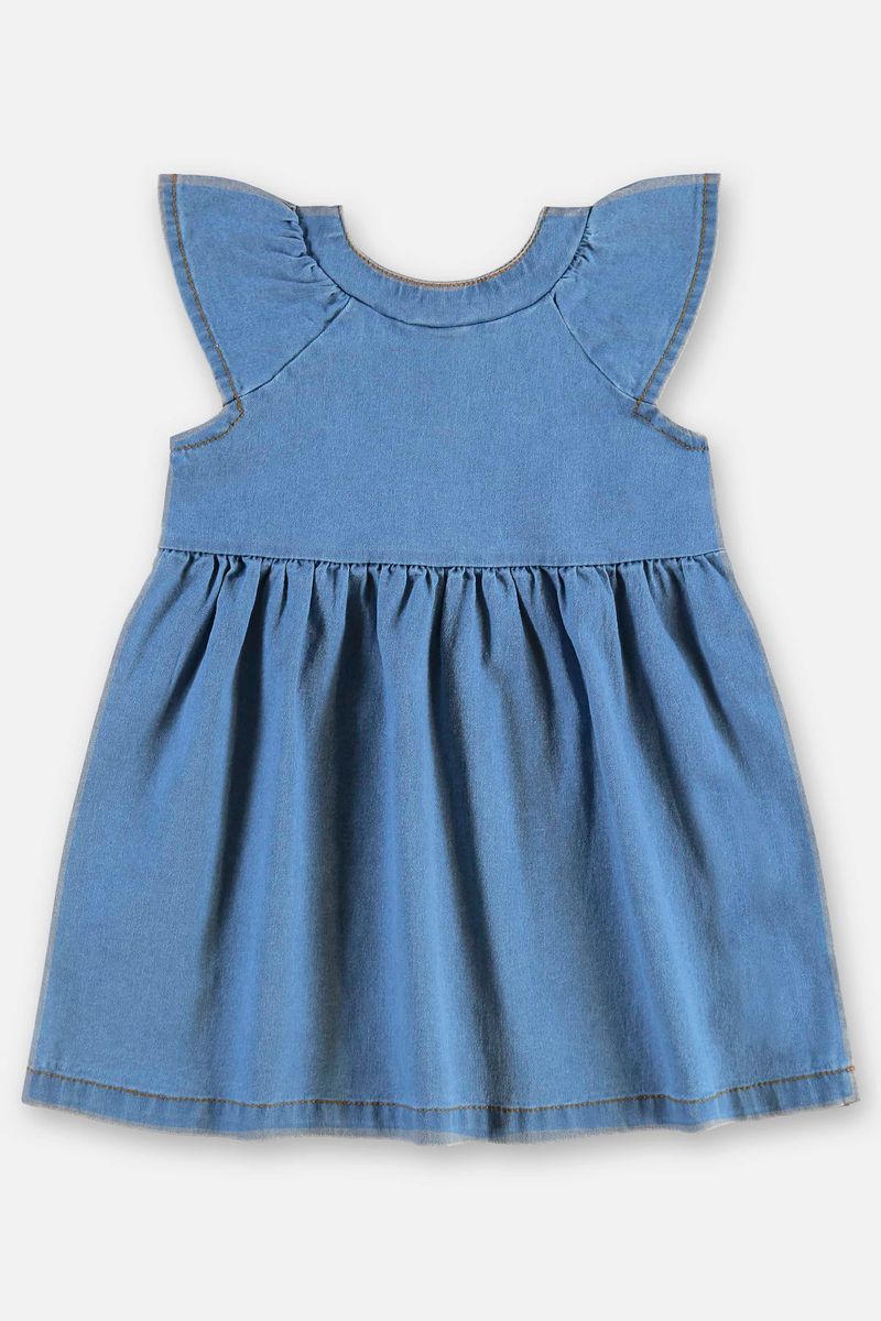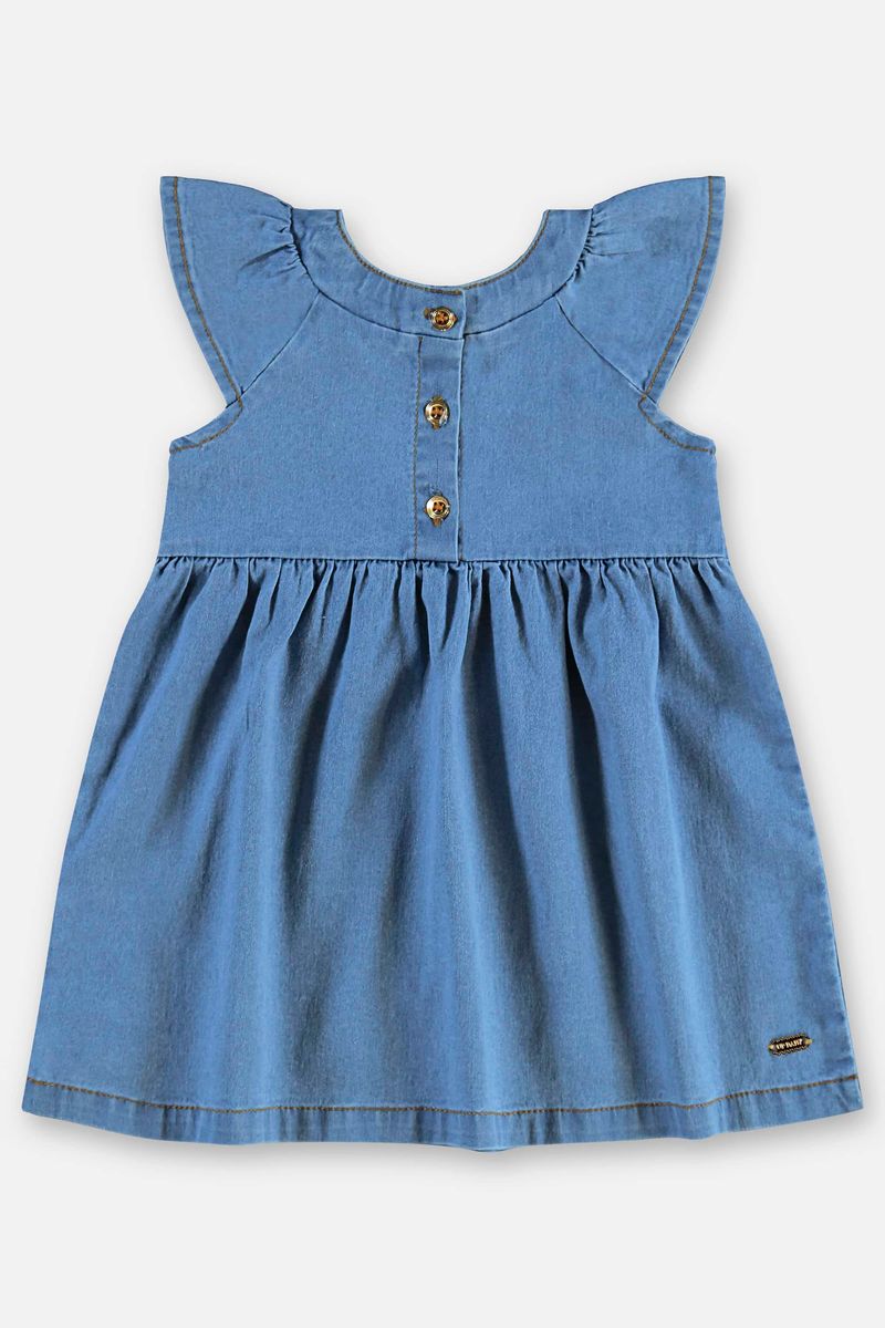 Vestido para bebê menina, perfeito para deixar os momentos ainda mais especiais. Confeccionado em jeans (algodão, poliéster e elastano), possui efeito lavanderia, processo que confere textura e aparência exclusiva à peça. Conta com gola redonda dupla, babados nas mangas com franzido total, abertura frontal com botões e recorte com franzido na cintura. Peça ideal tanto para ocasiões casuais quanto para ocasiões especiais.