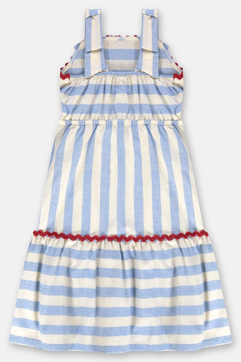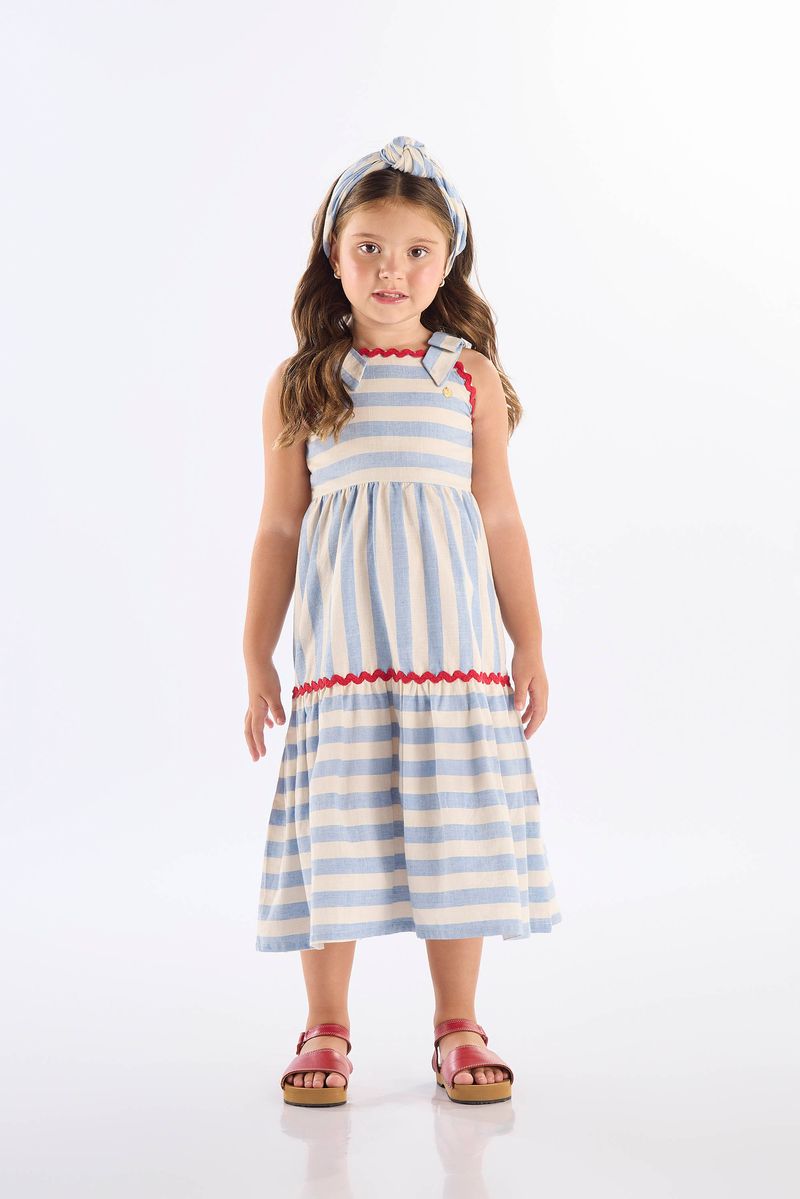 Vestido midi infantil confeccionado em algodão listrado, tecido leve e respirável que garante conforto. Com caimento abaixo do joelho, possui alças com detalhe em laço fixo, decote e cavas com aplicação de sianinha e recortes franzidos. Uma peça versátil para o dia a dia ou ocasiões casuais.
